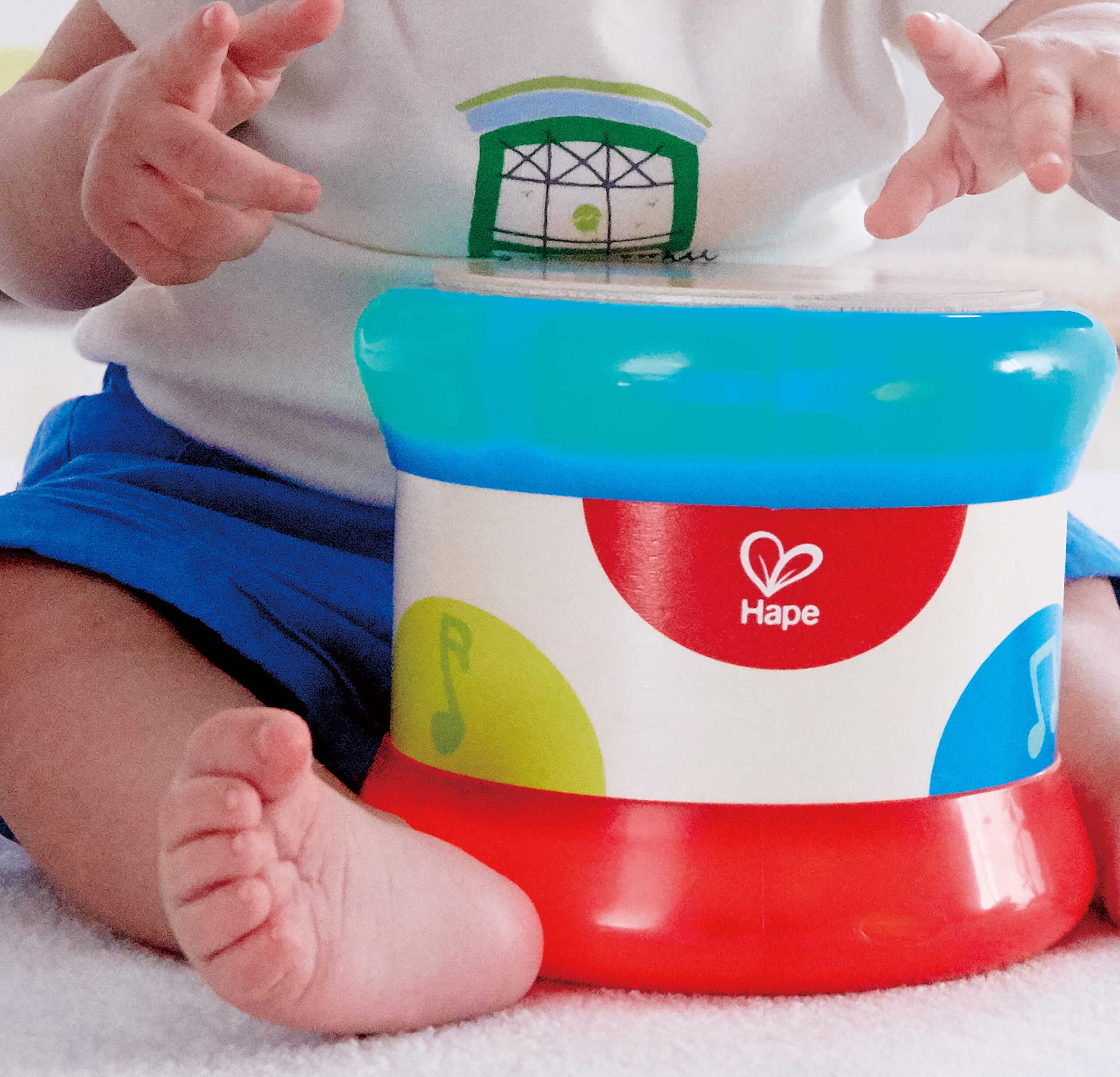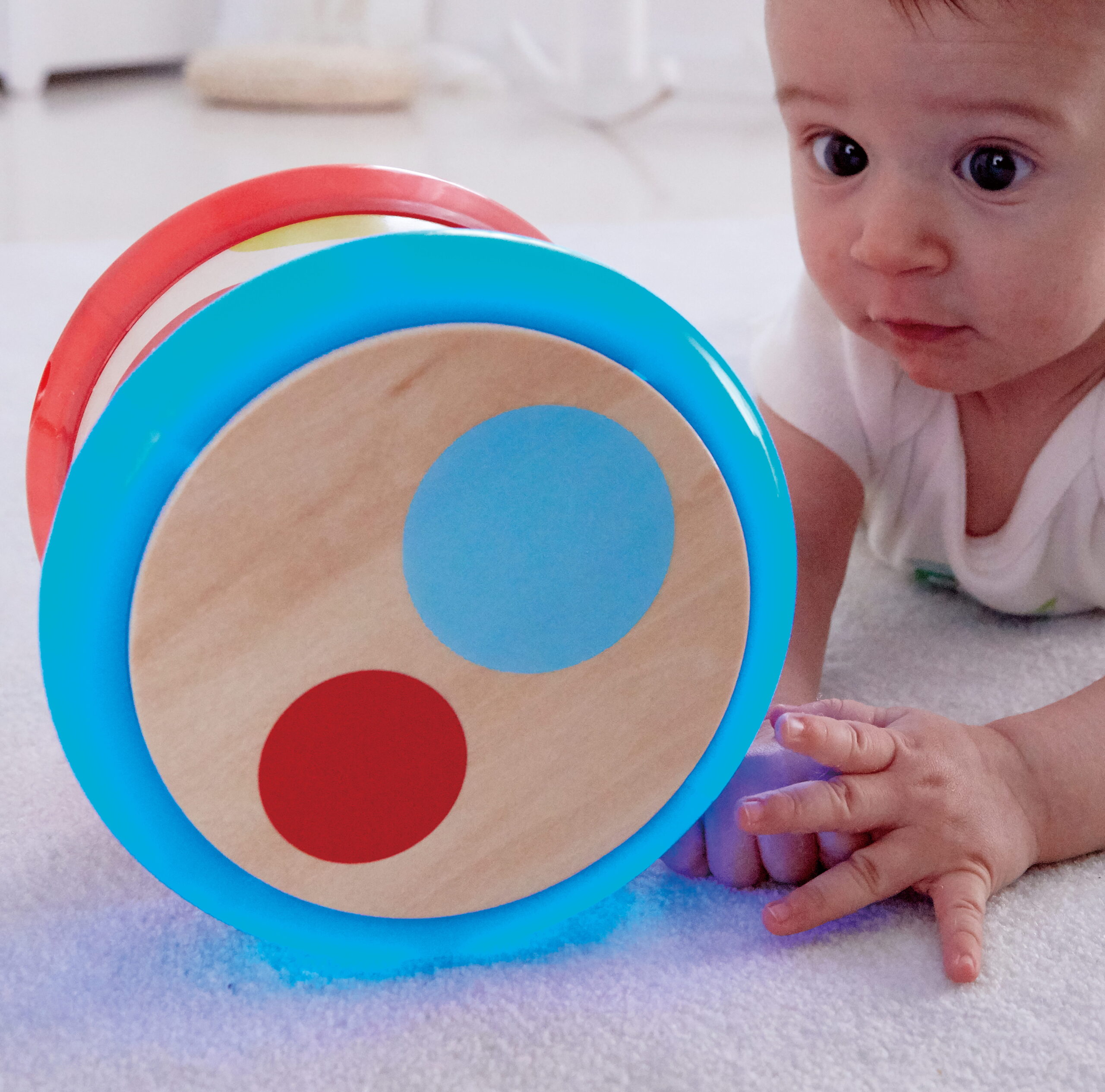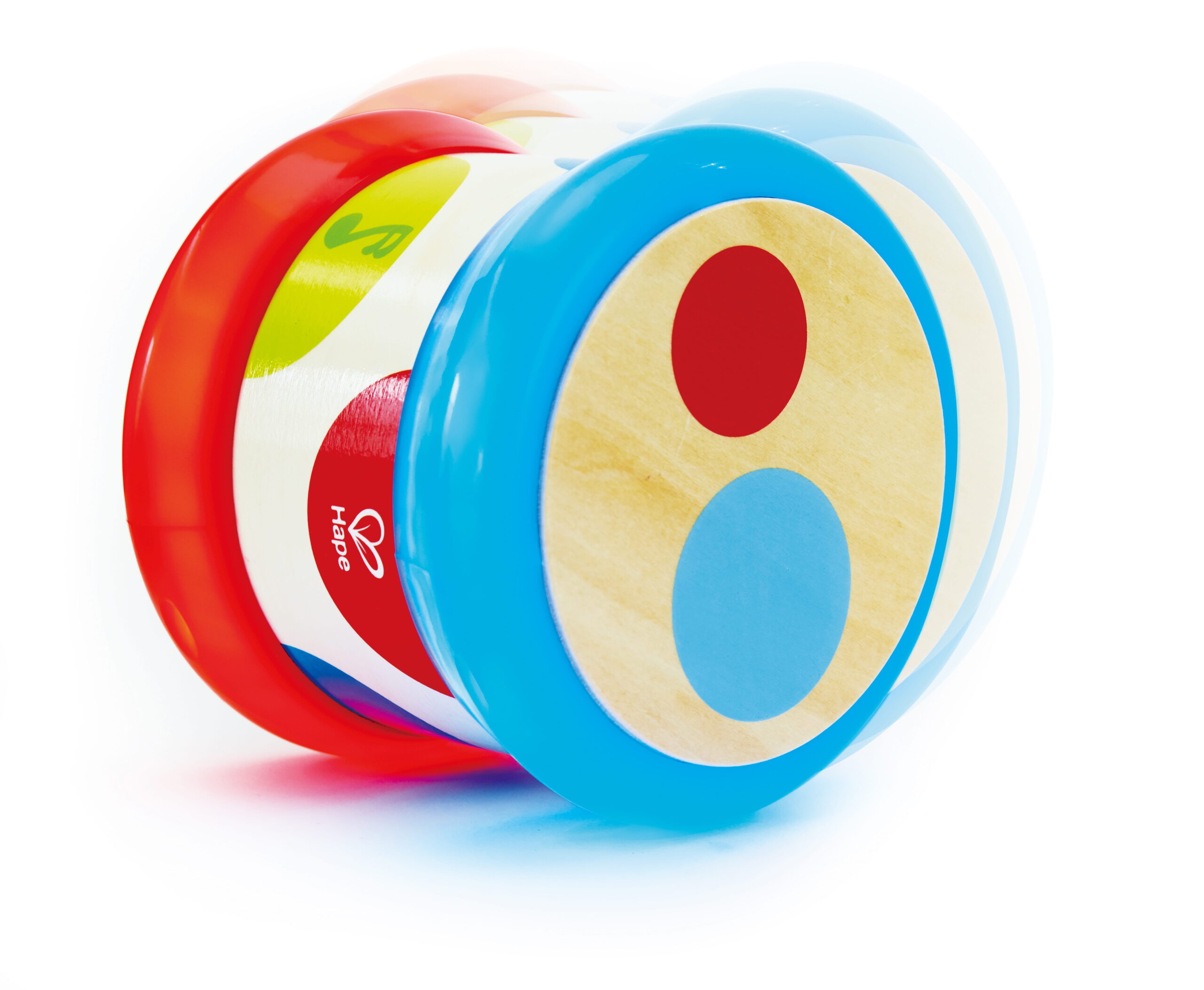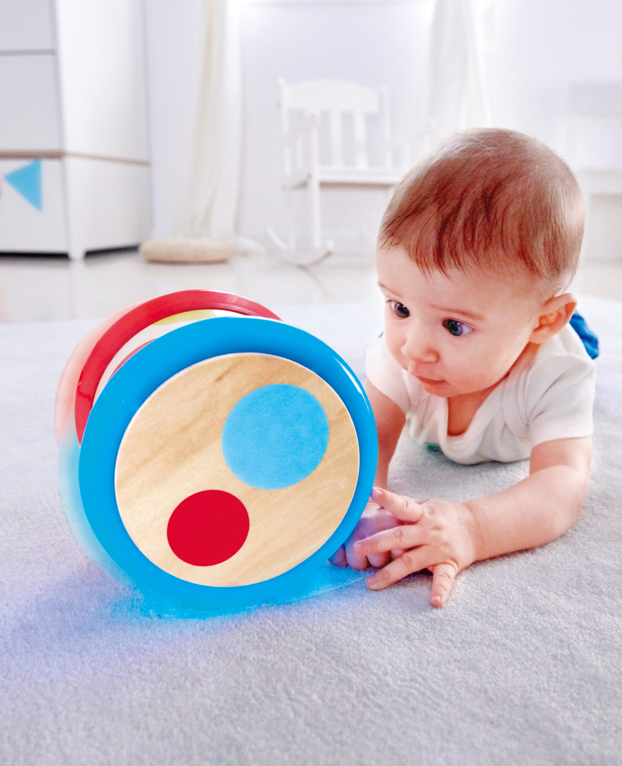 A ritmus nem tanulással kezdődik, hanem mozdulattal. Ez a gördíthető babadob úgy lett kialakítva, hogy a gyermek ne csak ütögesse, hanem mozgásba is hozza – így a hang és a fizikai aktivitás egyszerre jelenik meg a játék során.