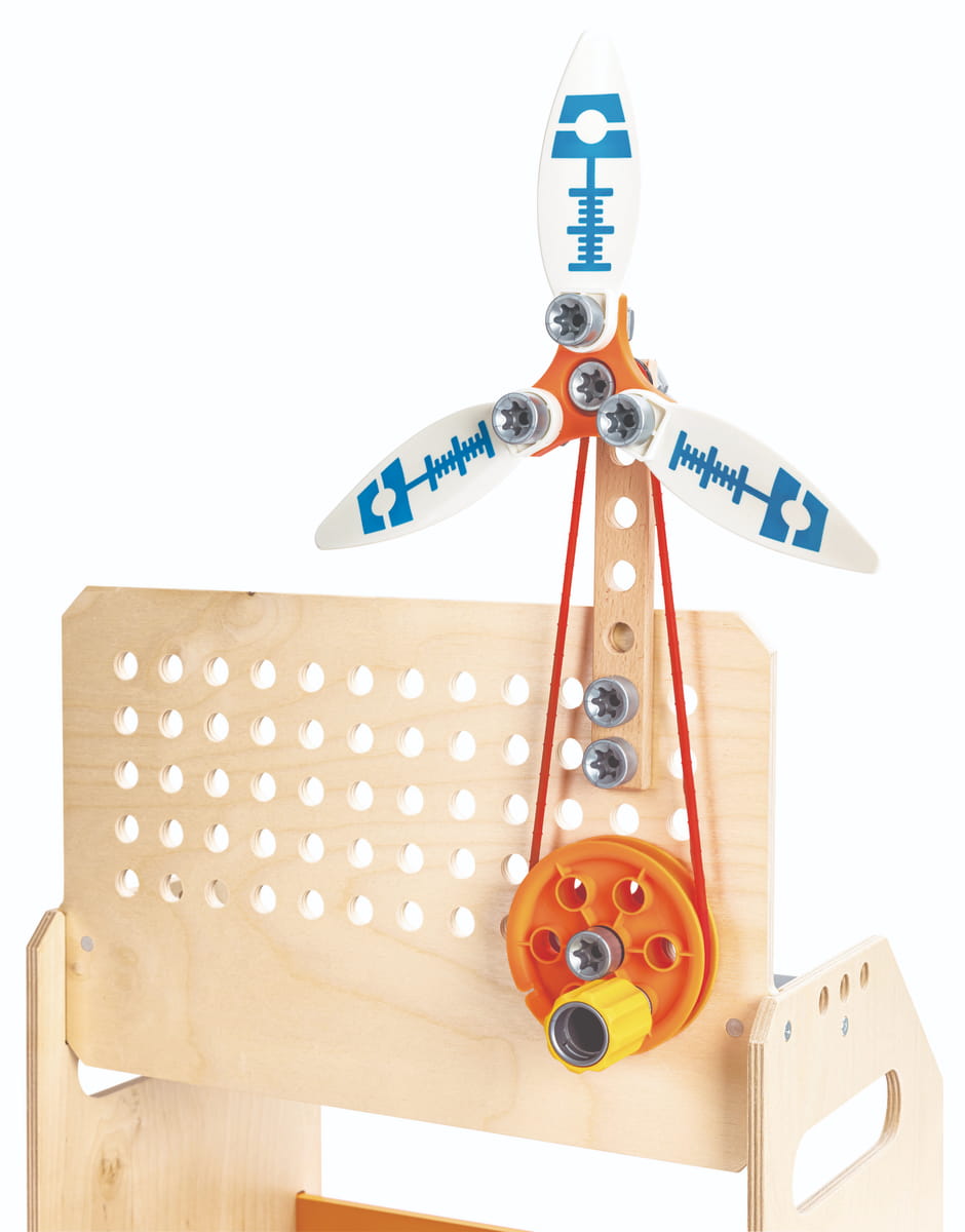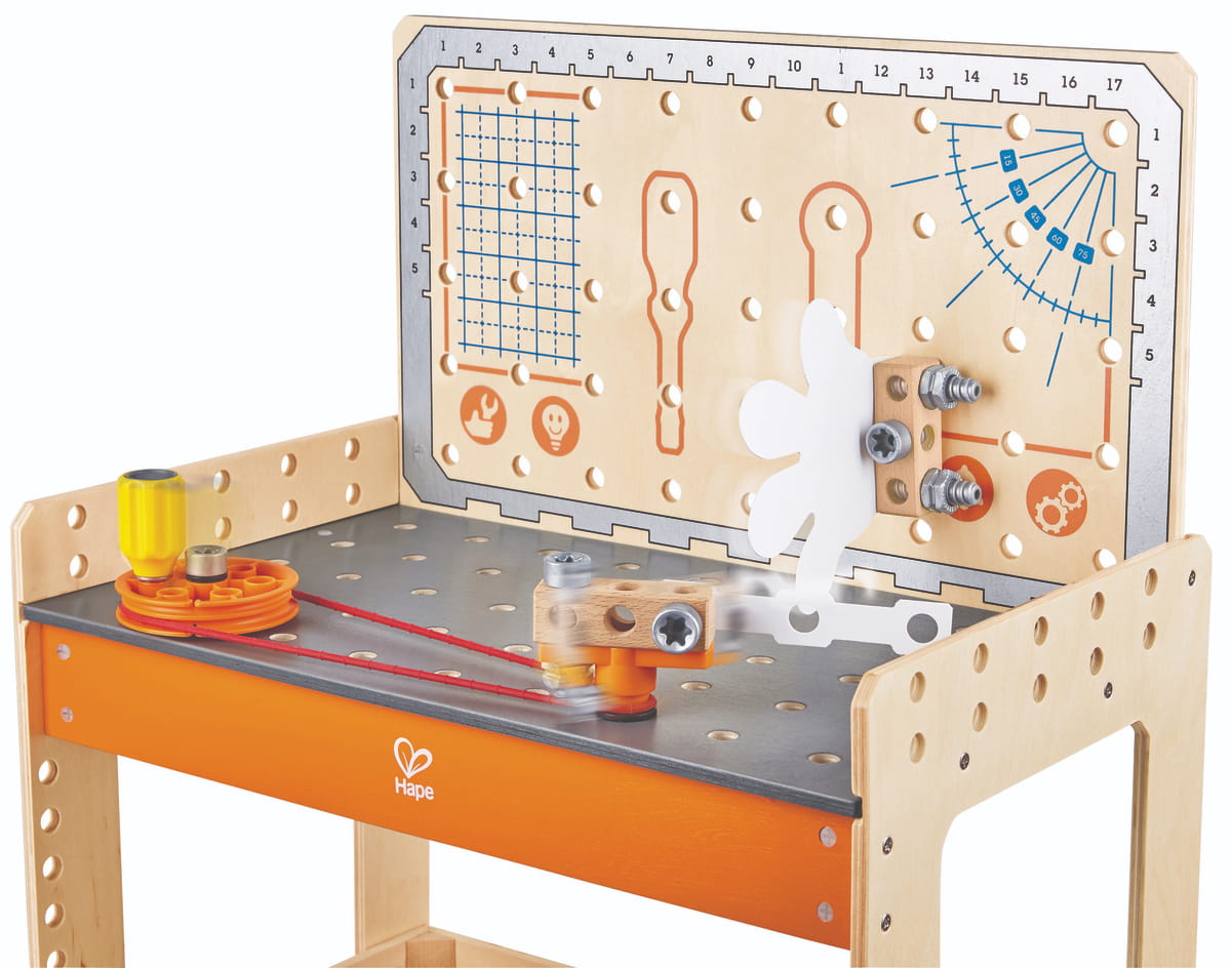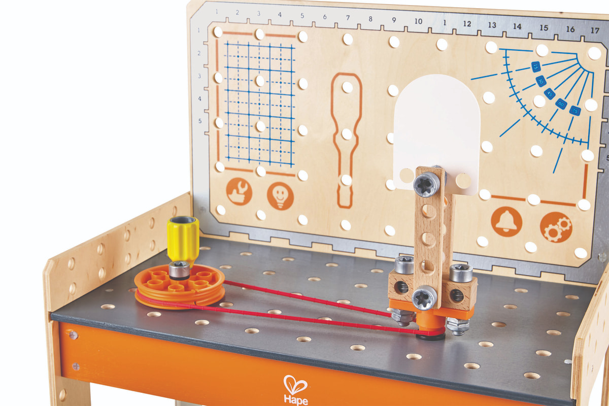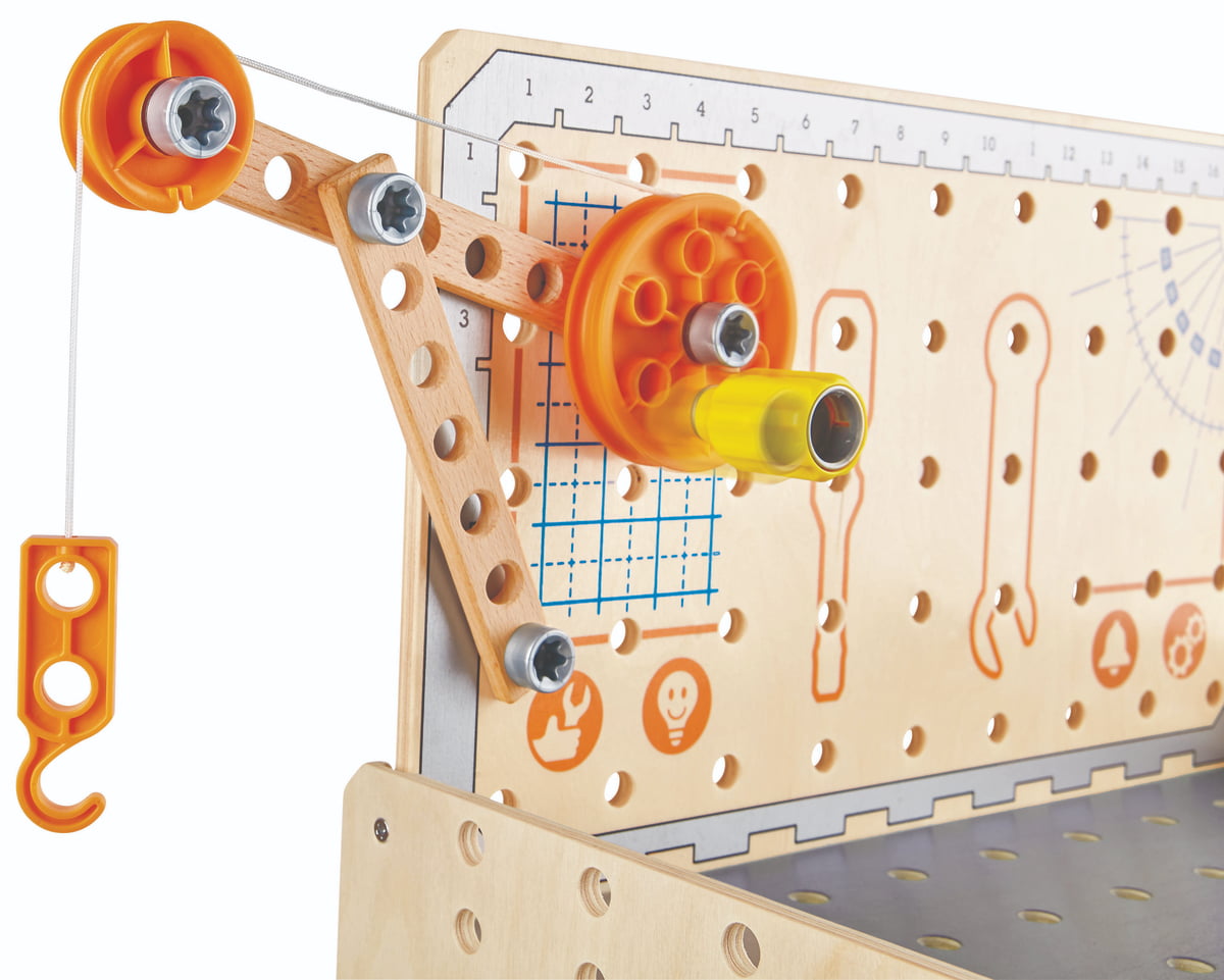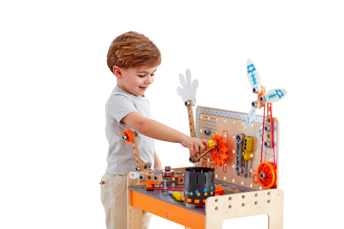 A Deluxe Tudományos Munkapad ötvözi a klasszikus szerelős játékot az alapvető tudományos kísérletezéssel. A gyerekek nemcsak csavaroznak és kalapálnak – hanem megértik az ok-okozatot, a mozgást, a mágnesességet és az egyszerű mechanikát.