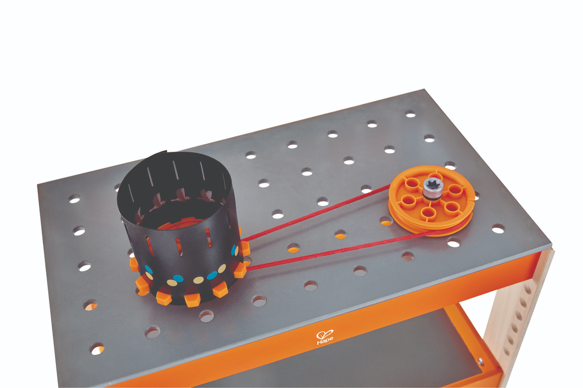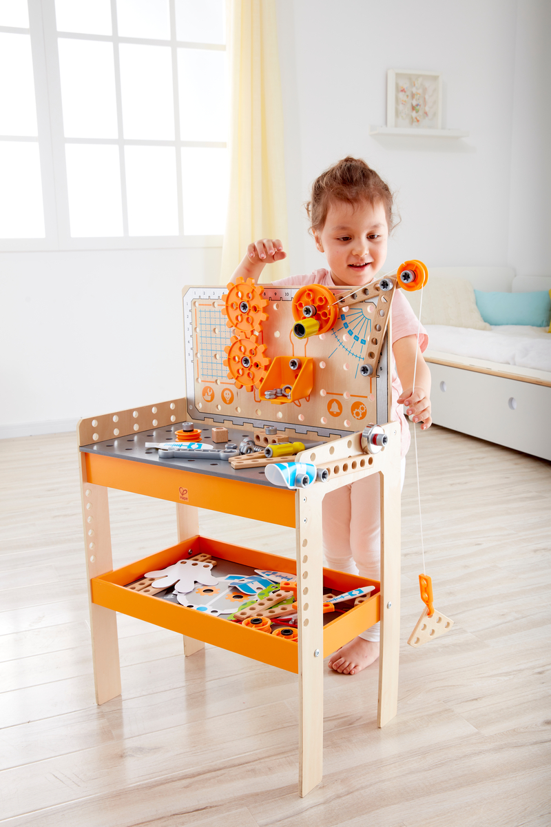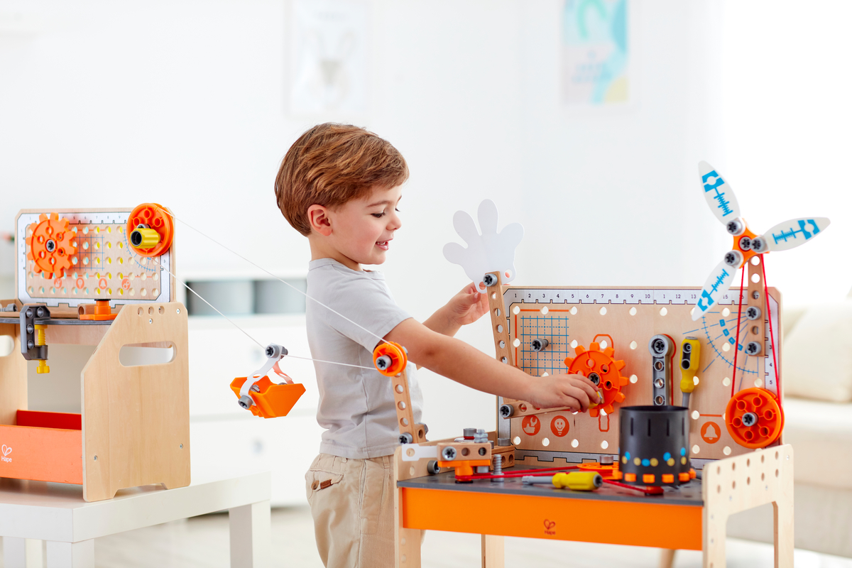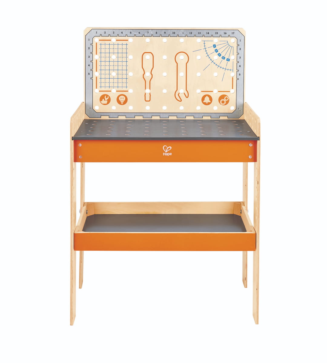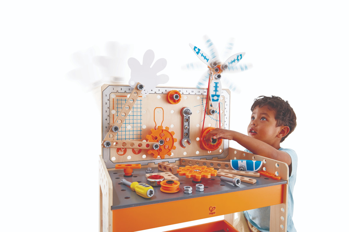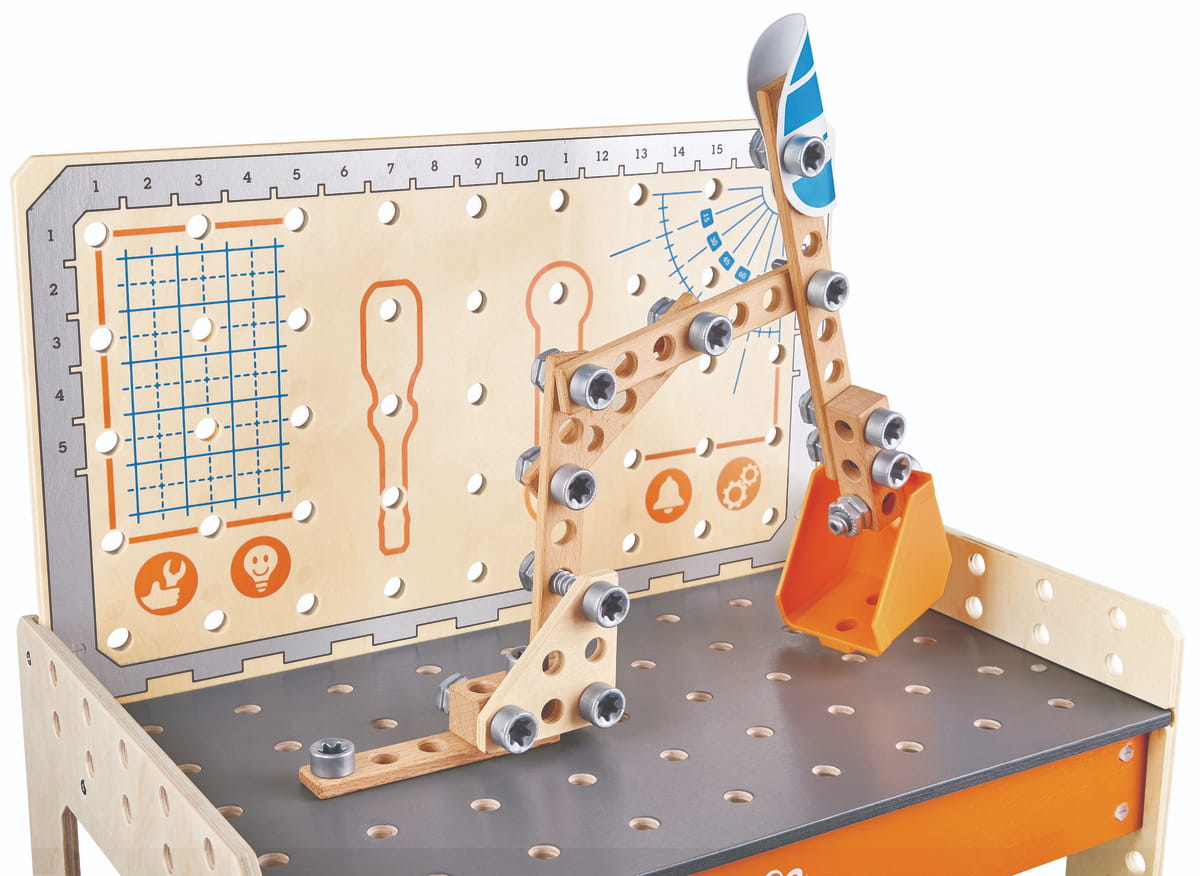 A Deluxe Tudományos Munkapad ötvözi a klasszikus szerelős játékot az alapvető tudományos kísérletezéssel. A gyerekek nemcsak csavaroznak és kalapálnak – hanem megértik az ok-okozatot, a mozgást, a mágnesességet és az egyszerű mechanikát.