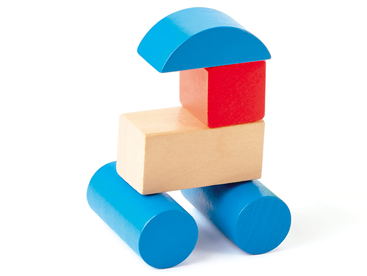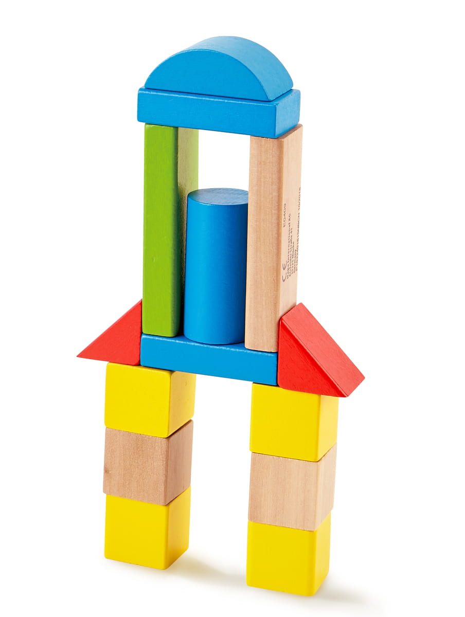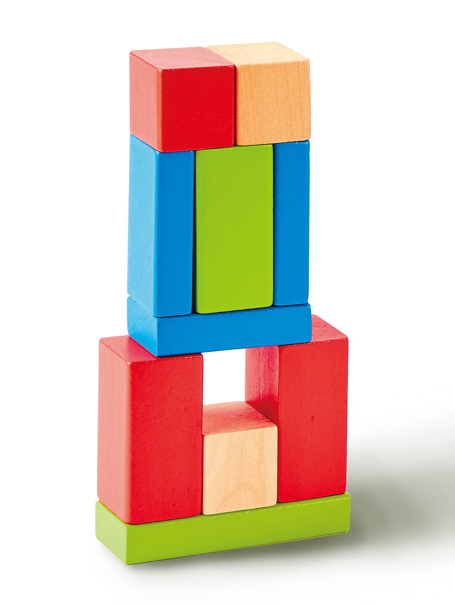 A különböző formájú és méretű elemek – színes és natúr kivitelben – lehetővé teszik tornyok, házak, hidak és saját fantáziavilágok megalkotását. A juharfa alapanyag stabil, tartós és simára csiszolt felületű, így a blokkok pontosan illeszthetők és kényelmesen megfoghatók. Az eltérő formák segítik a térbeli gondolkodás és az arányérzék fejlődését.