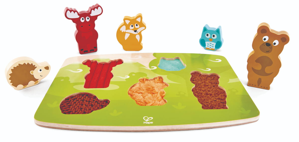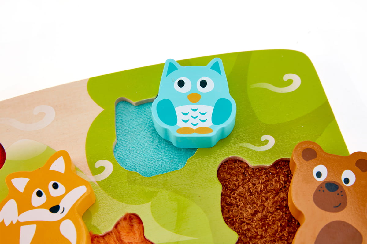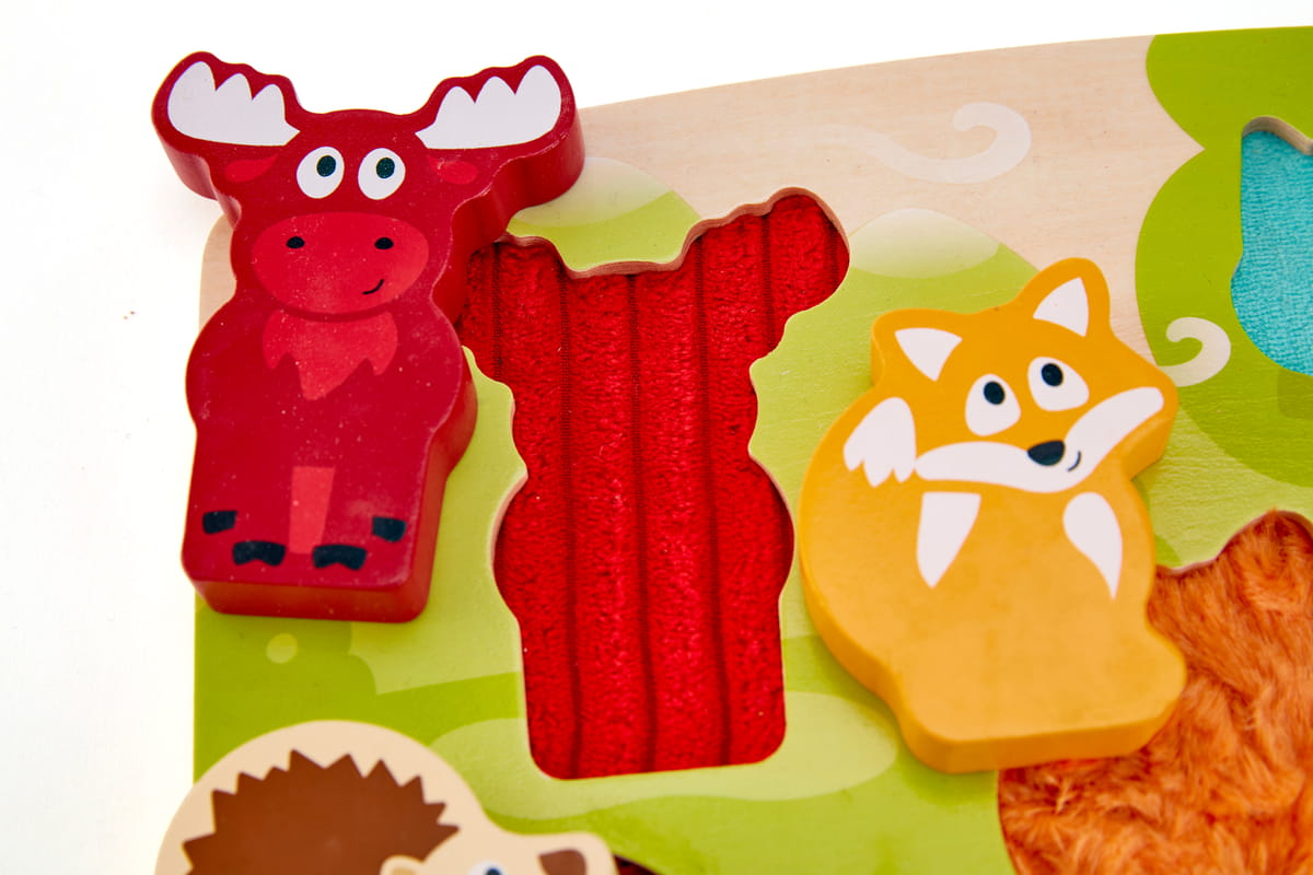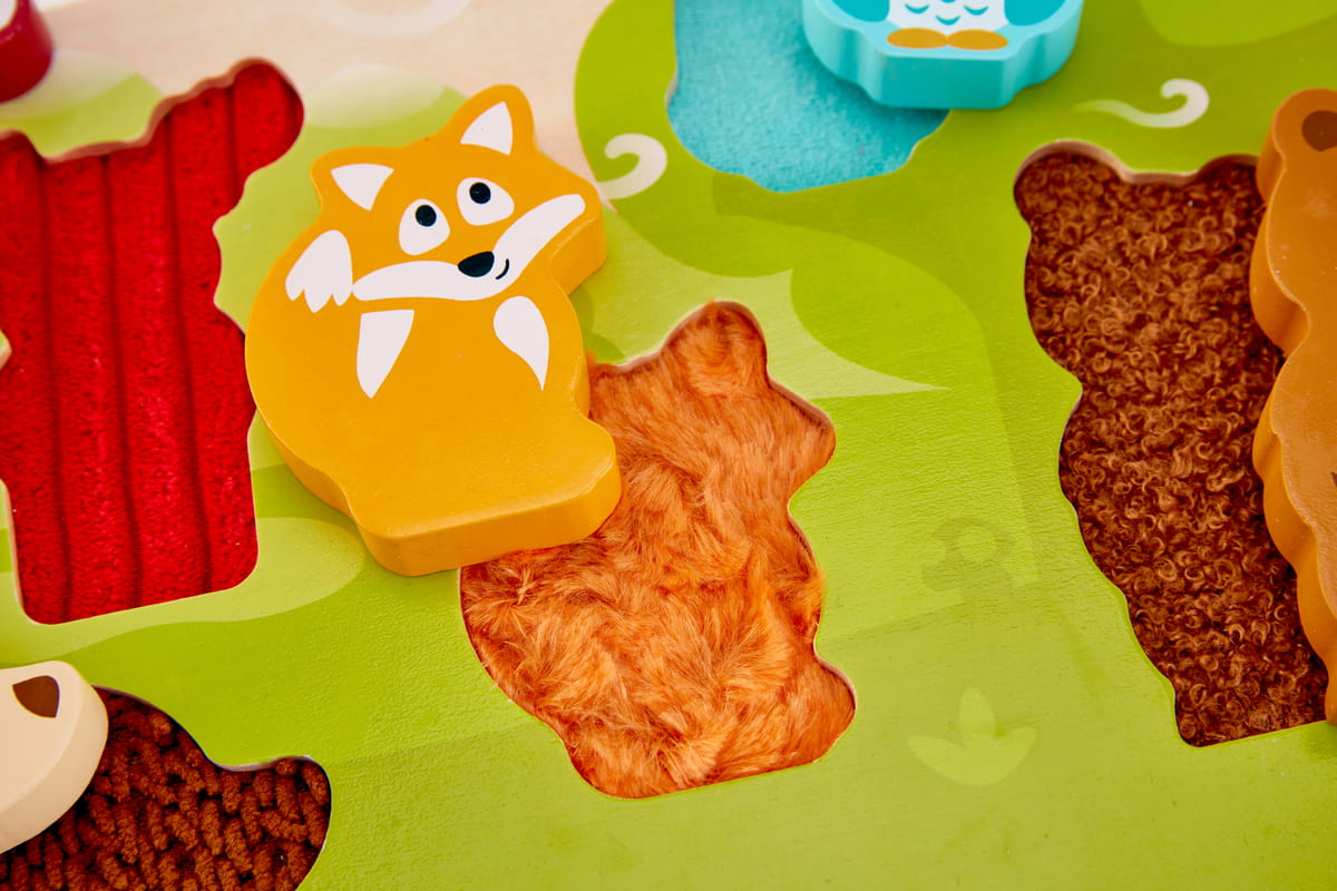 Az erdei állatokat ábrázoló elemek különböző textúrával készültek, így a gyermek nemcsak formát illeszt, hanem felületeket is felfedez. A látás és tapintás együtt dolgozik – ez erősíti a szenzoros integrációt már kicsi korban.