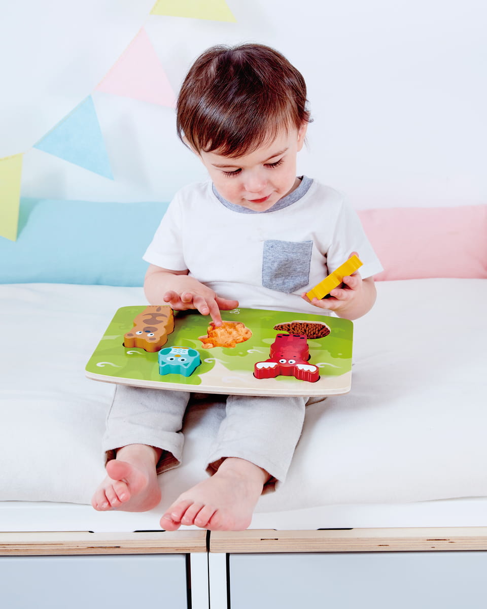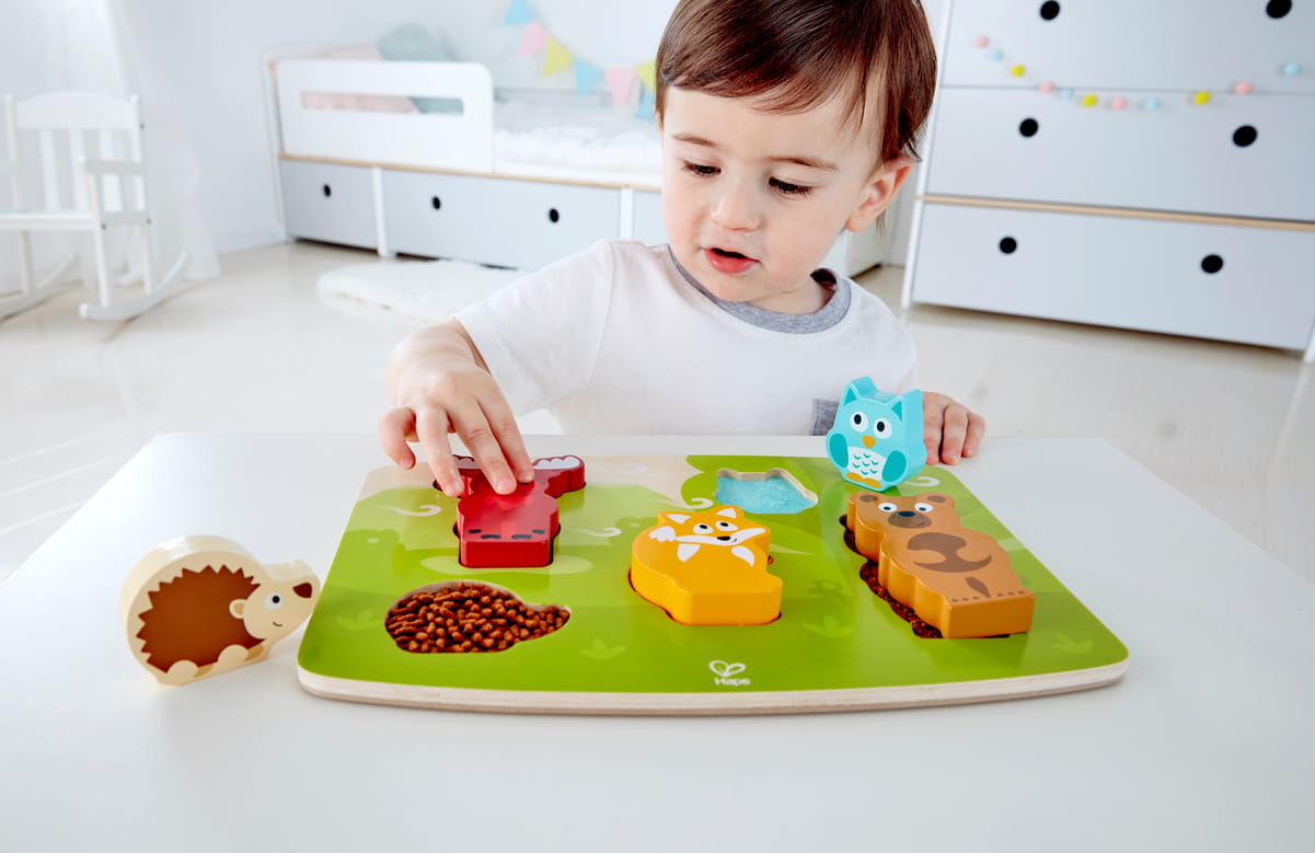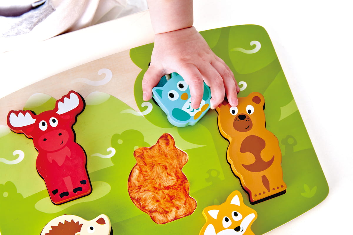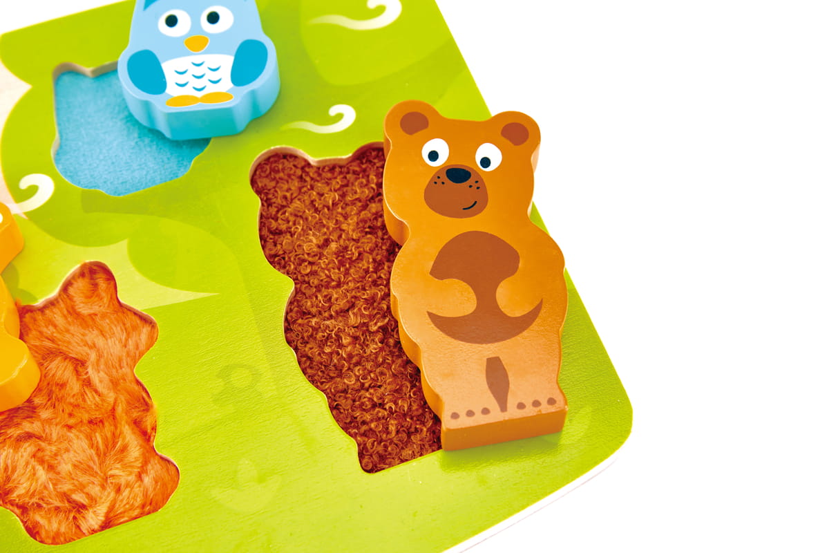 Az erdei állatokat ábrázoló elemek különböző textúrával készültek, így a gyermek nemcsak formát illeszt, hanem felületeket is felfedez. A látás és tapintás együtt dolgozik – ez erősíti a szenzoros integrációt már kicsi korban.