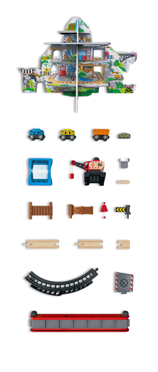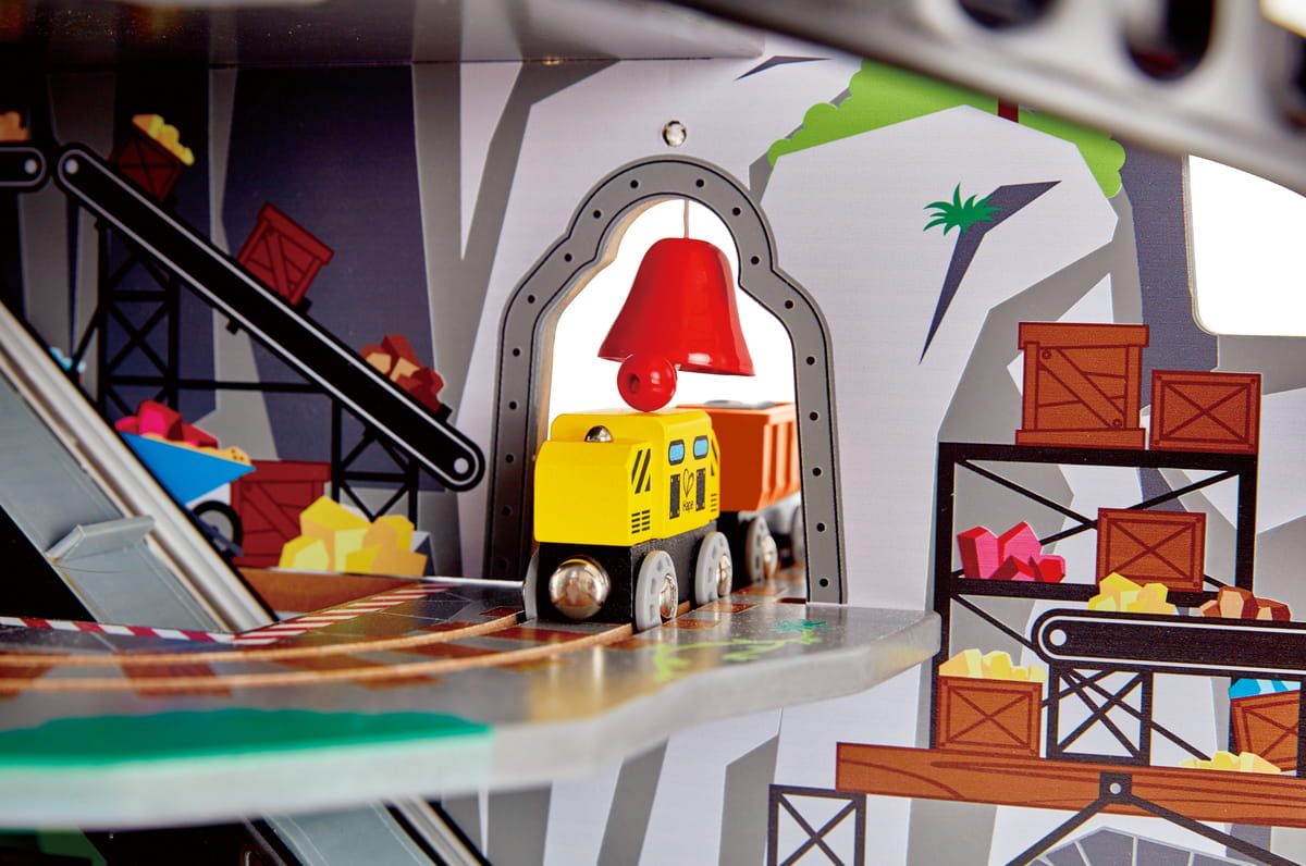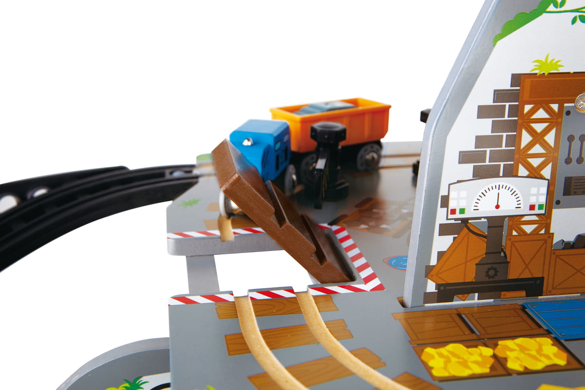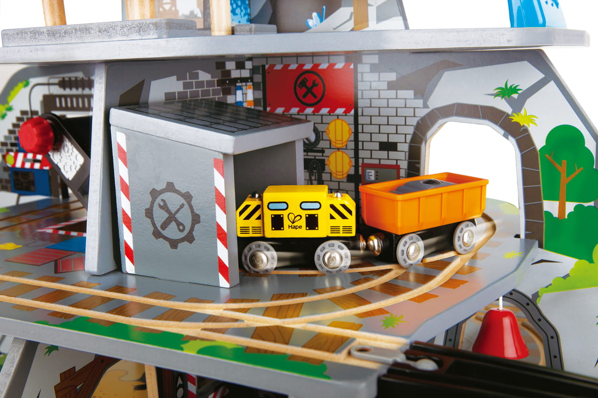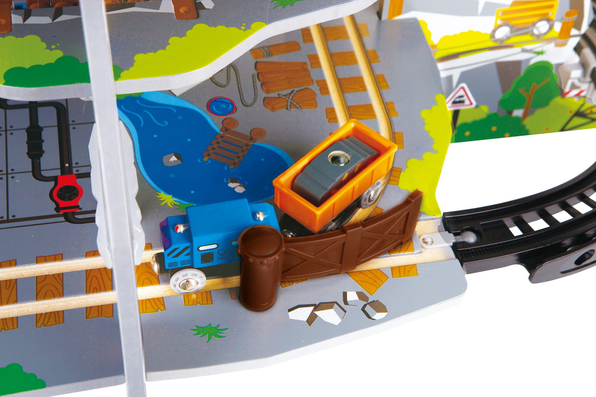 Lépj be a vasút és bánya izgalmas világába ezzel a lenyűgöző, több szintes fa vasúti játékkészlettel! A Hatalmas Hegyi Bánya egy masszív, interaktív pálya, ahol a gyermek a nagy vasútvonattal végigvezethet egy izgalmas utat a hegy tetejétől egészen a működő bánya mélyéig.