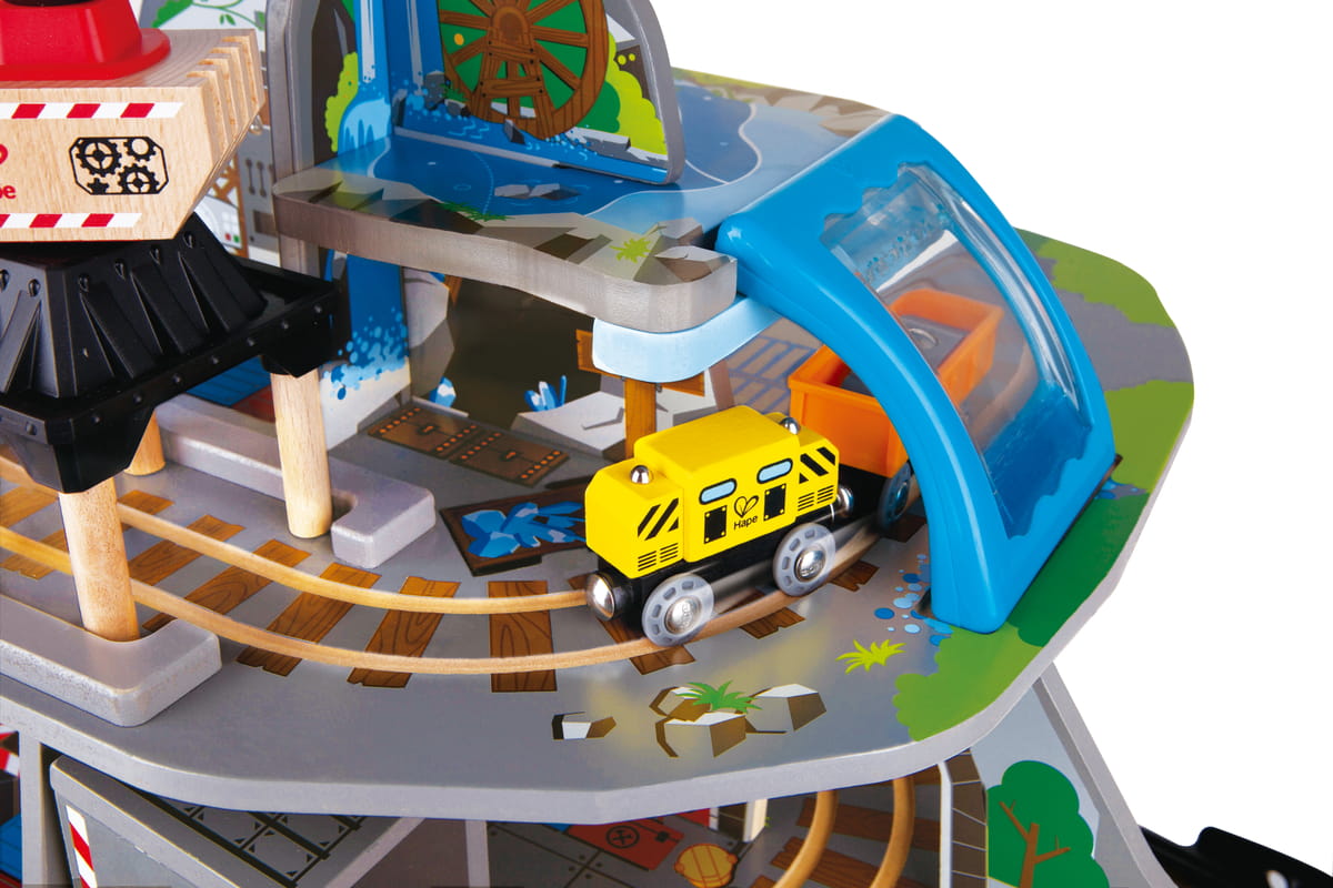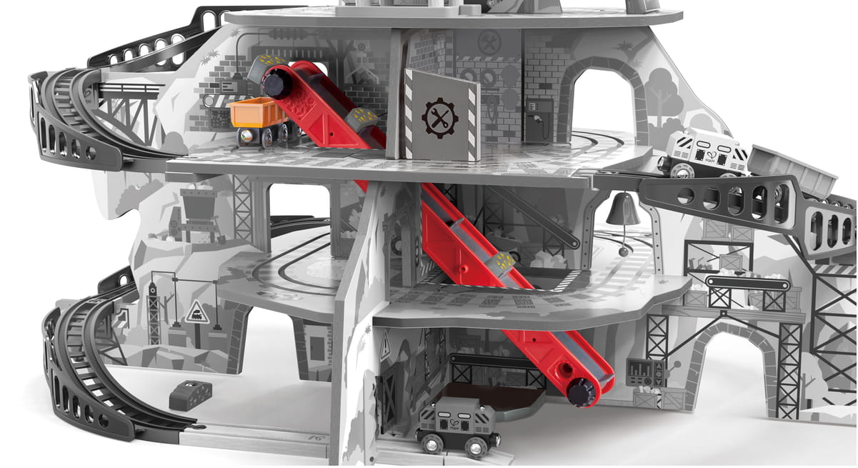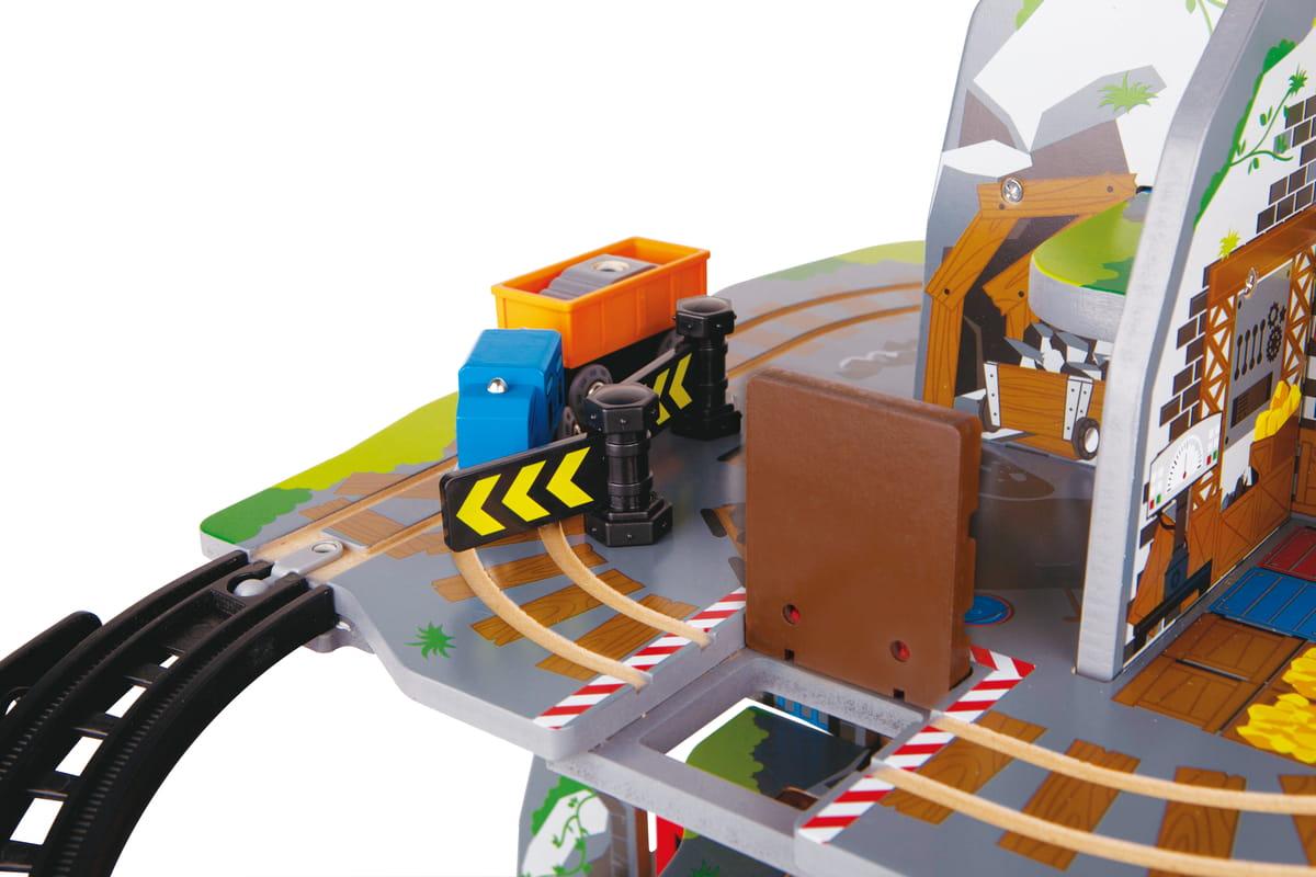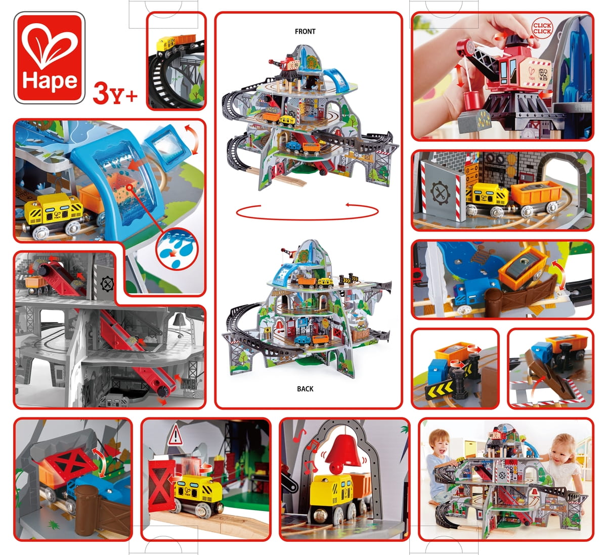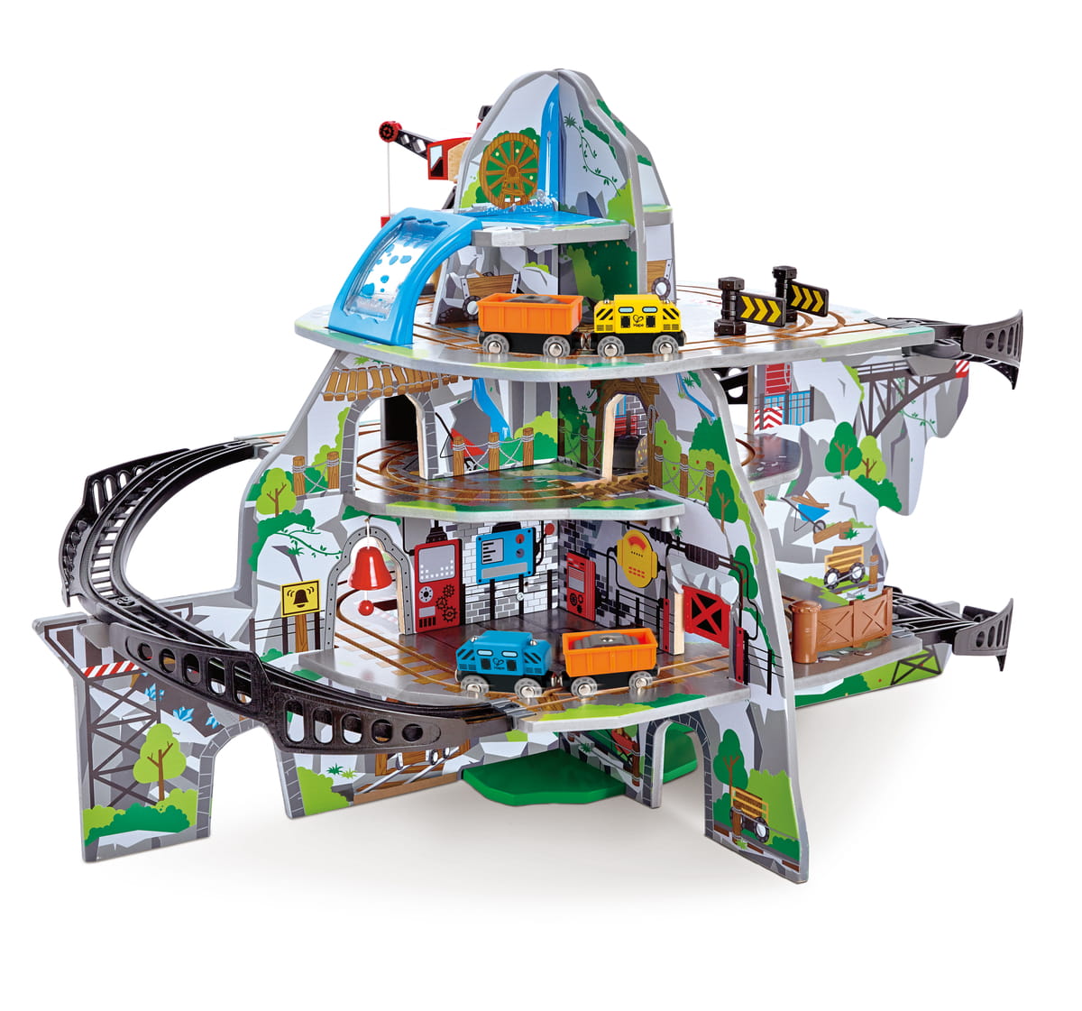 Lépj be a vasút és bánya izgalmas világába ezzel a lenyűgöző, több szintes fa vasúti játékkészlettel! A Hatalmas Hegyi Bánya egy masszív, interaktív pálya, ahol a gyermek a nagy vasútvonattal végigvezethet egy izgalmas utat a hegy tetejétől egészen a működő bánya mélyéig.