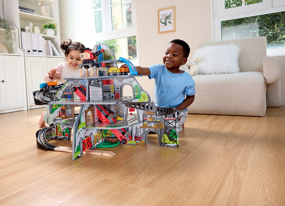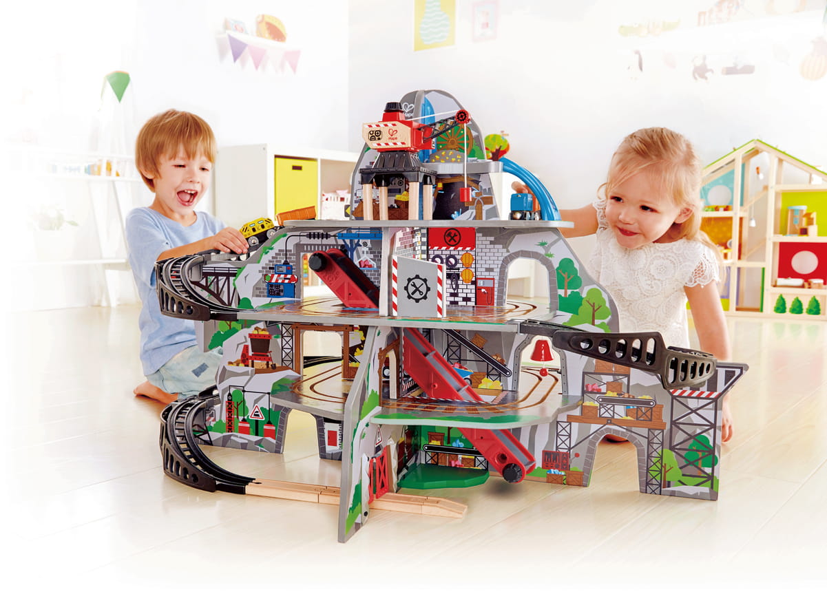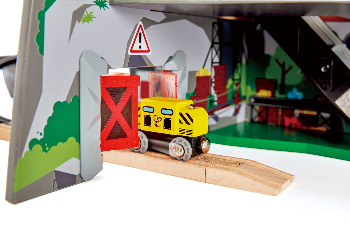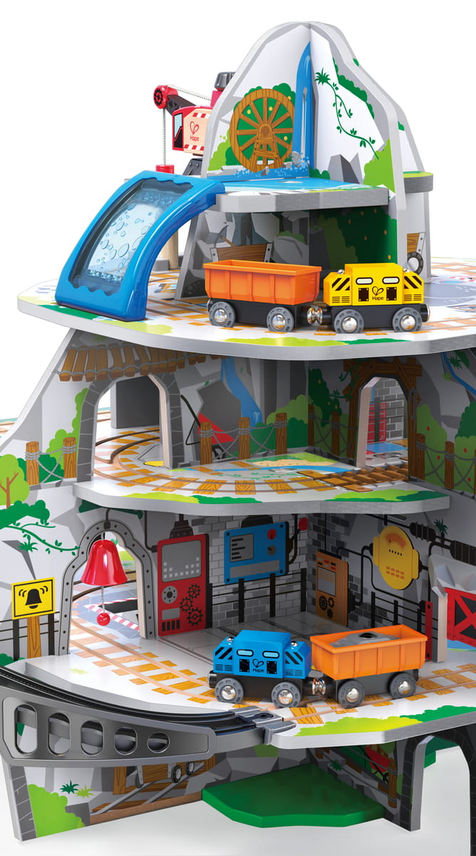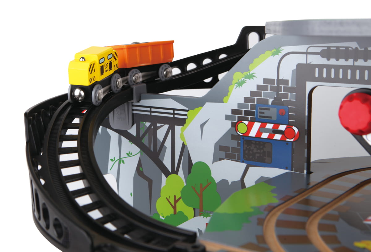 Lépj be a vasút és bánya izgalmas világába ezzel a lenyűgöző, több szintes fa vasúti játékkészlettel! A Hatalmas Hegyi Bánya egy masszív, interaktív pálya, ahol a gyermek a nagy vasútvonattal végigvezethet egy izgalmas utat a hegy tetejétől egészen a működő bánya mélyéig.