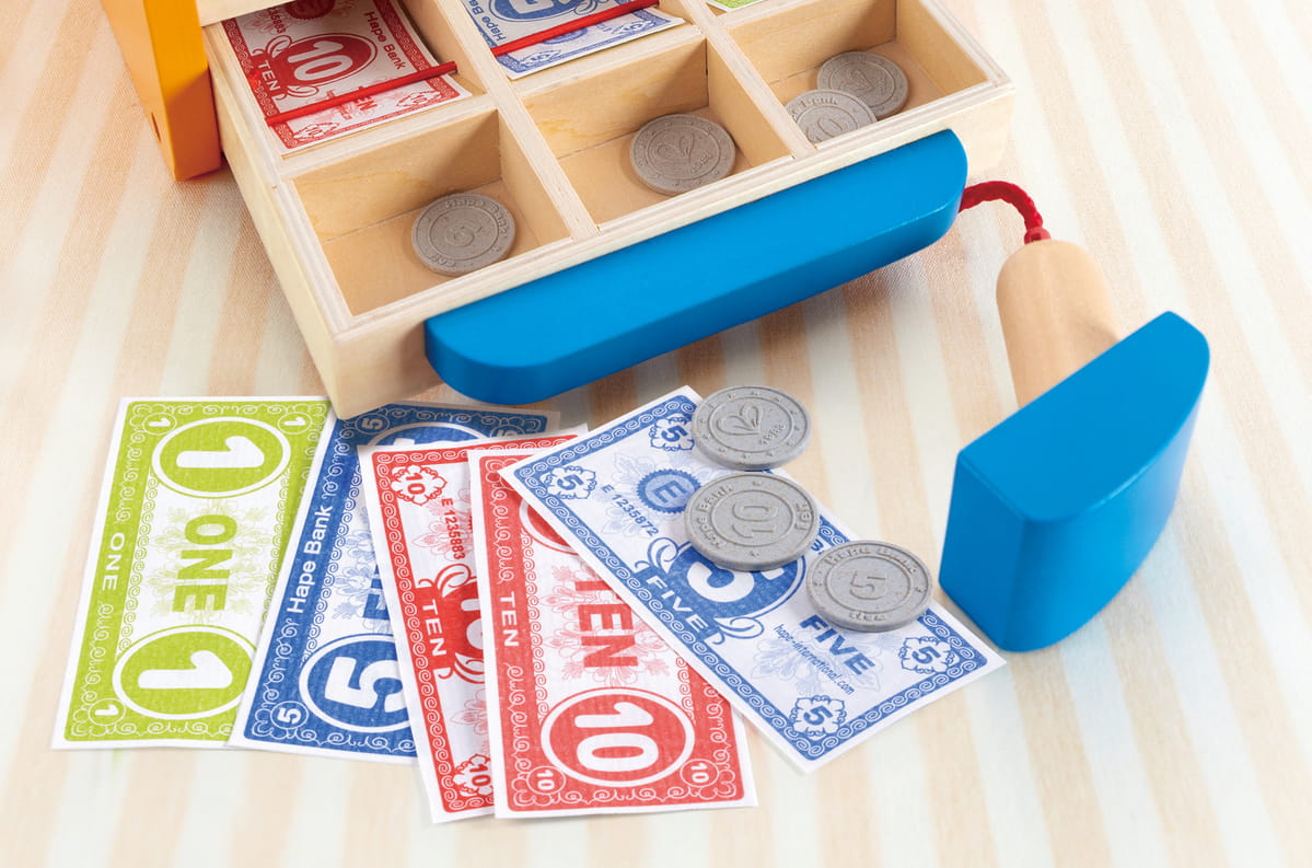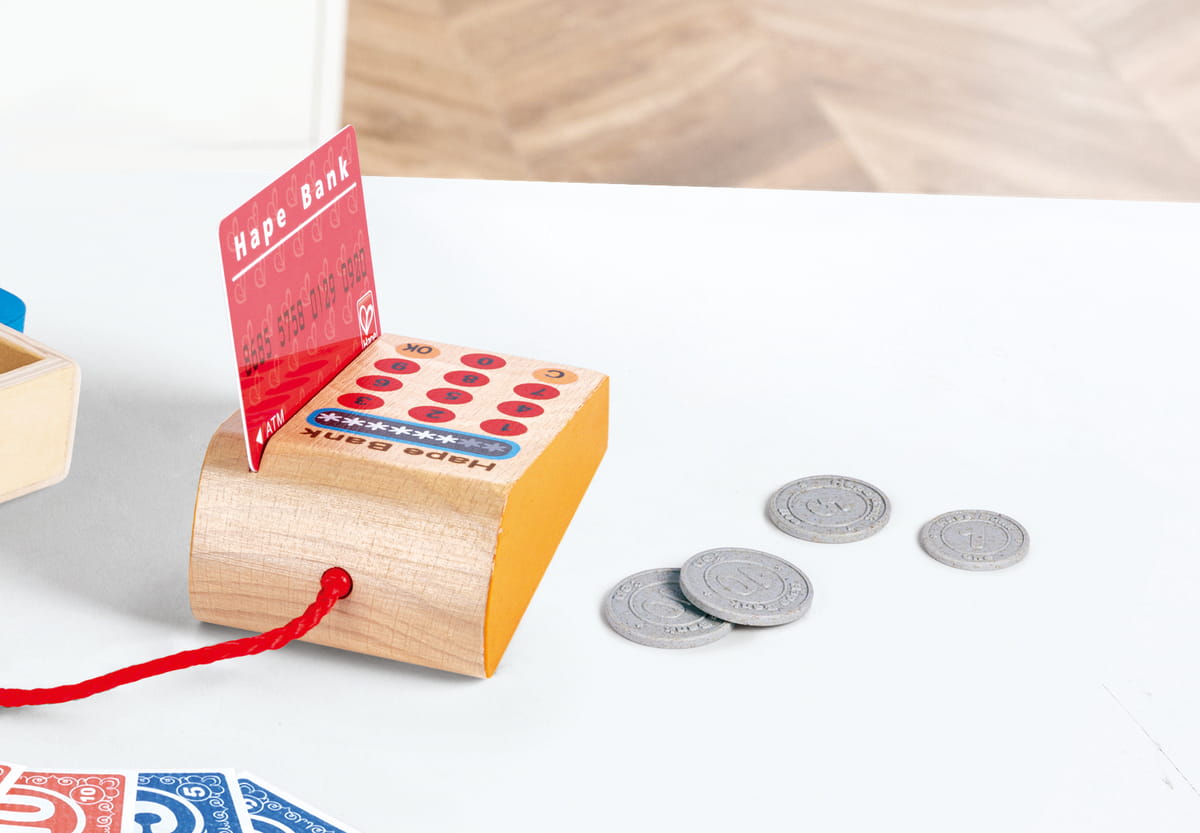 A készlet tartalmaz papírpénzt, érméket, bankkártyát és nyugtatömböt, így a játék még valósághűbb. A beépített számoló (abakusz) segíti a számolás tanulását, így a gyerekek játék közben gyakorolhatják az alapvető matematikai készségeket.