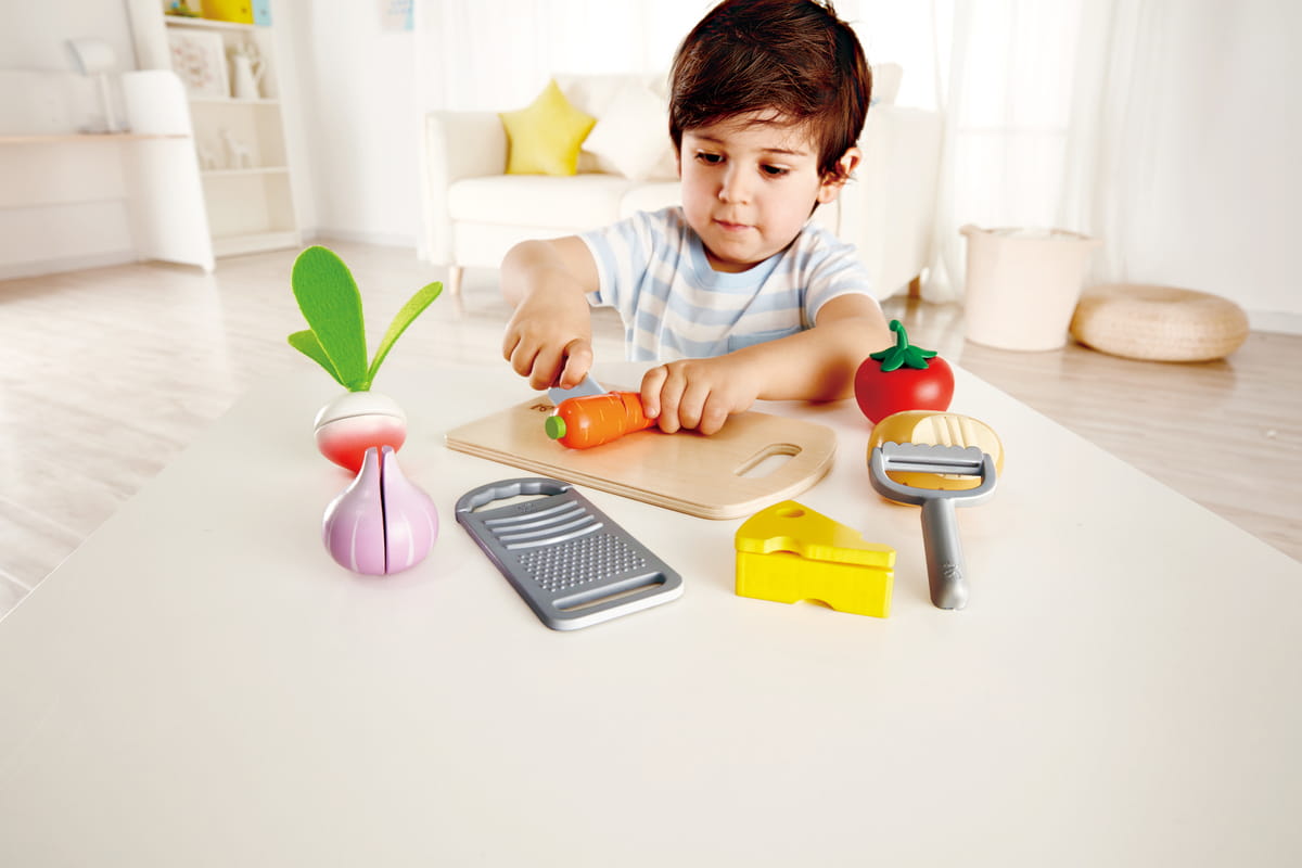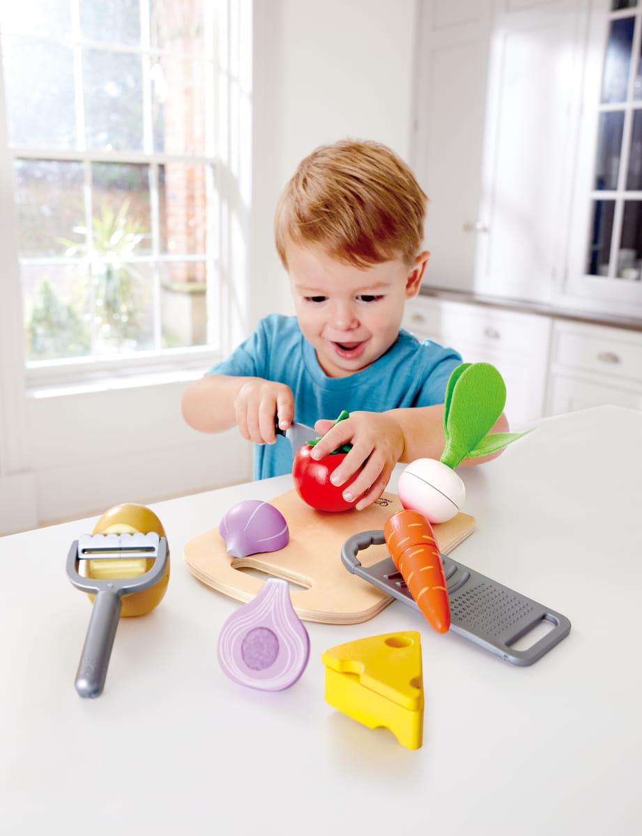 A zöldségek több részből állnak, így a gyerekek felvághatják, előkészíthetik és „megfőzhetik” őket. A játék során fejlődik a finommotorika, a kéz-szem koordináció és a kreatív történetalkotás.