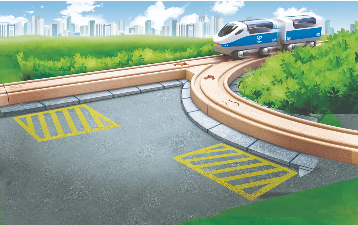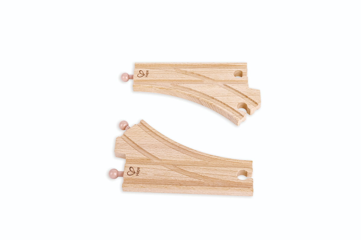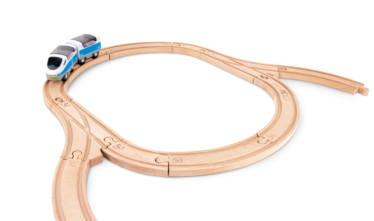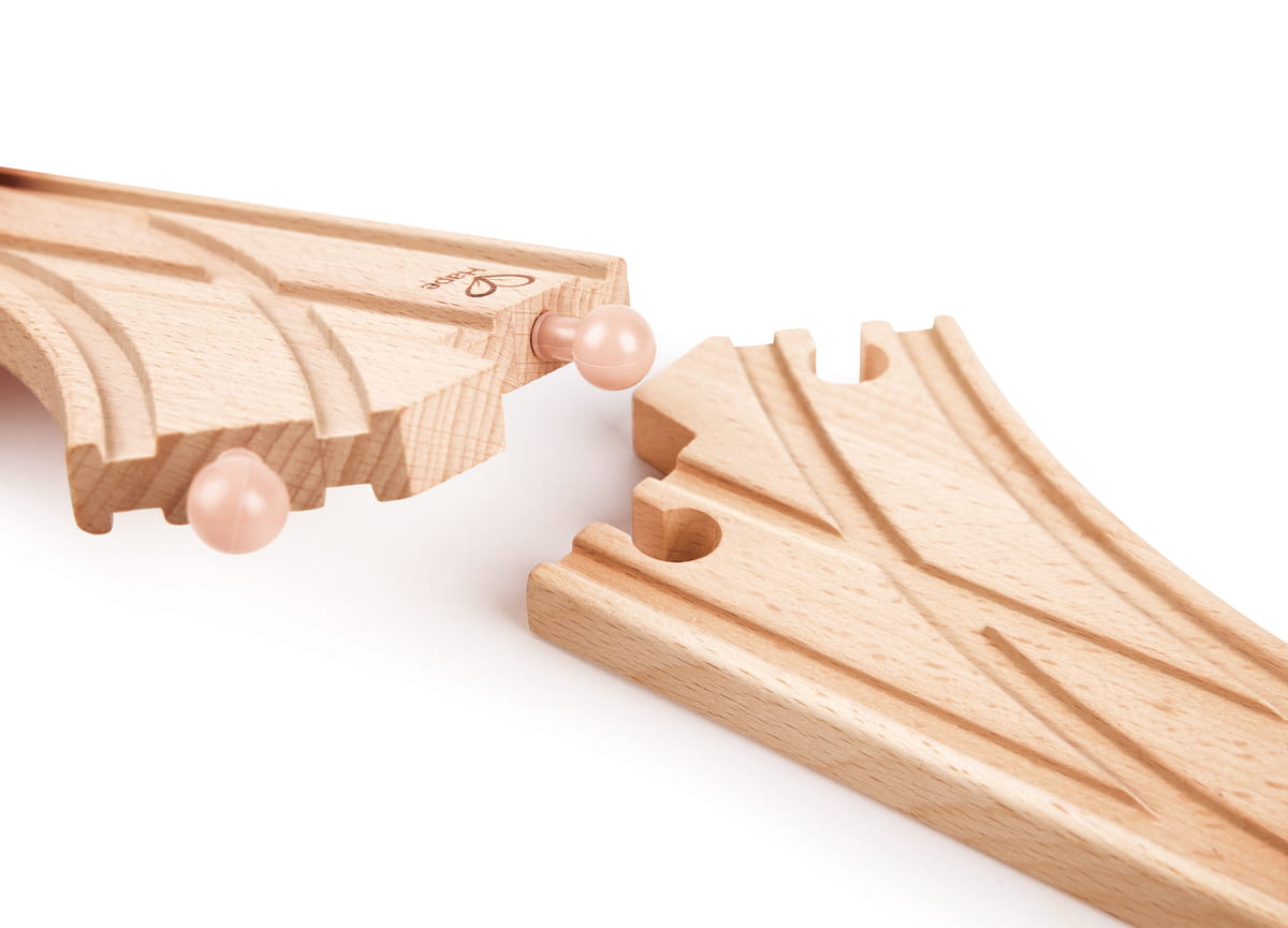 Tömör, tartós bükkfából készült fa sín elemek, simára csiszolt felülettel, amely kényelmes fogást biztosít a kis kezeknek. A 2 darabos készlet végtelen variációs lehetőséget ad a pályarendszer bővítéséhez, és kompatibilis más fa sínrendszerekkel.