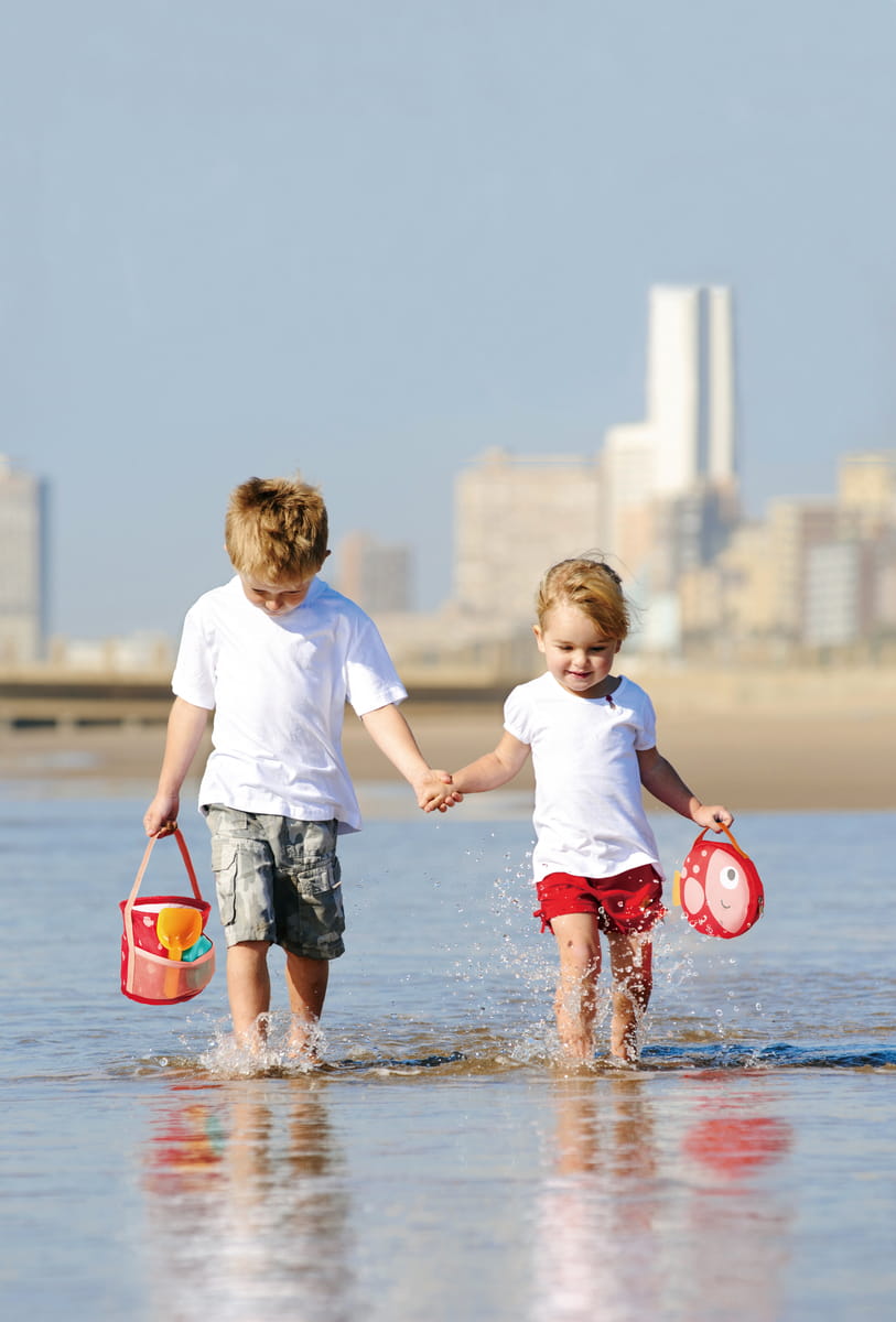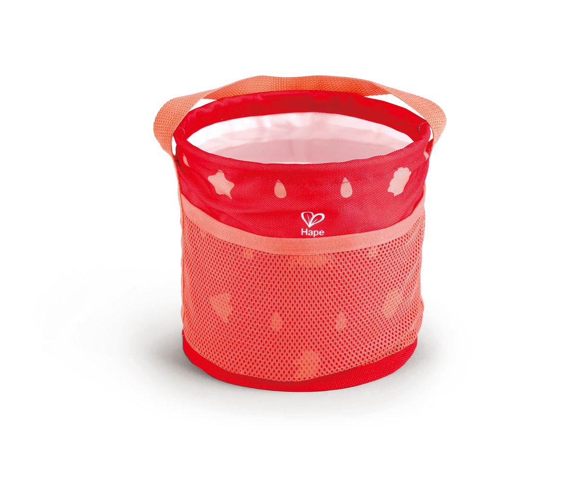 A hal mintás textiltáska egy kihajtható vödröt, egy lapátot és egy hal alakú homokformát rejt. A vízálló belső réteggel ellátott vödör nemcsak homokot, hanem vizet is képes megtartani, így a gyerekek könnyedén készíthetnek homokvárakat vagy homokfigurákat.