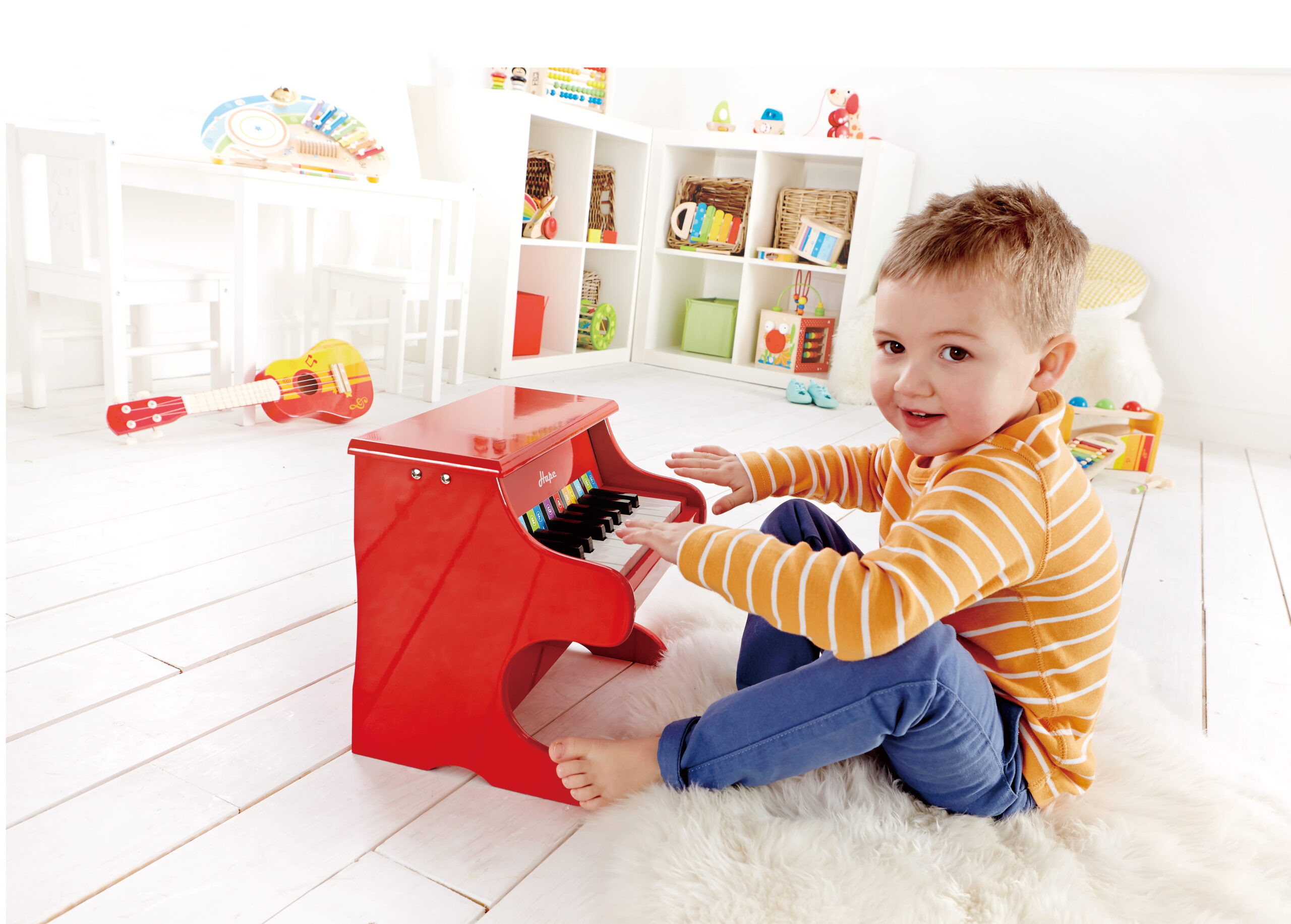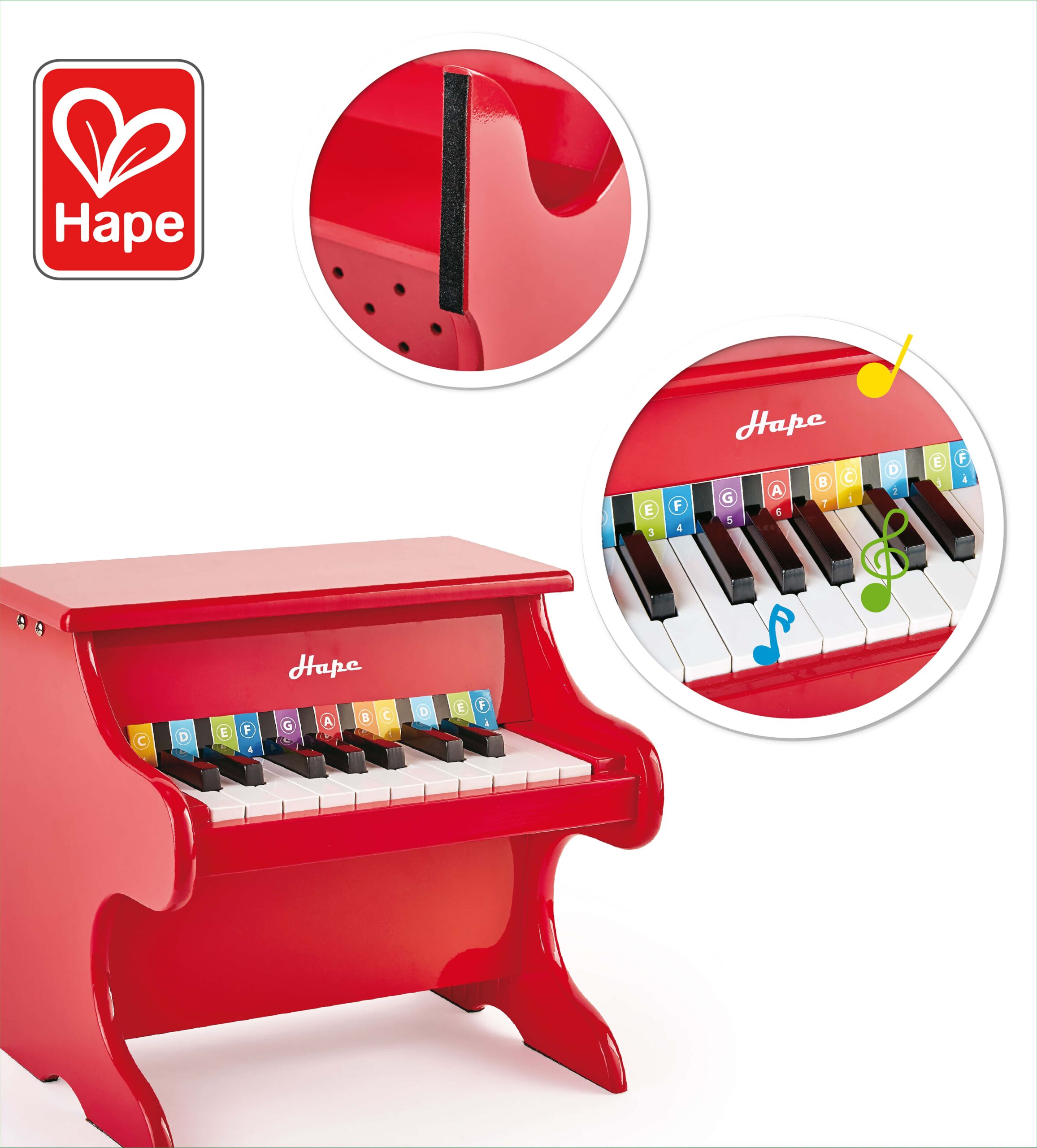 Fa alapanyagú, stabil kialakítása biztos tartást ad játék közben. A billentyűk kisgyermek kézhez igazítottak, könnyen lenyomhatók, így a próbálkozásokat gyors sikerélmény kíséri. A hangszer célja, hogy a gyermek játék közben fedezze fel a hangok sorrendjét, ismétlődését és ritmusát.