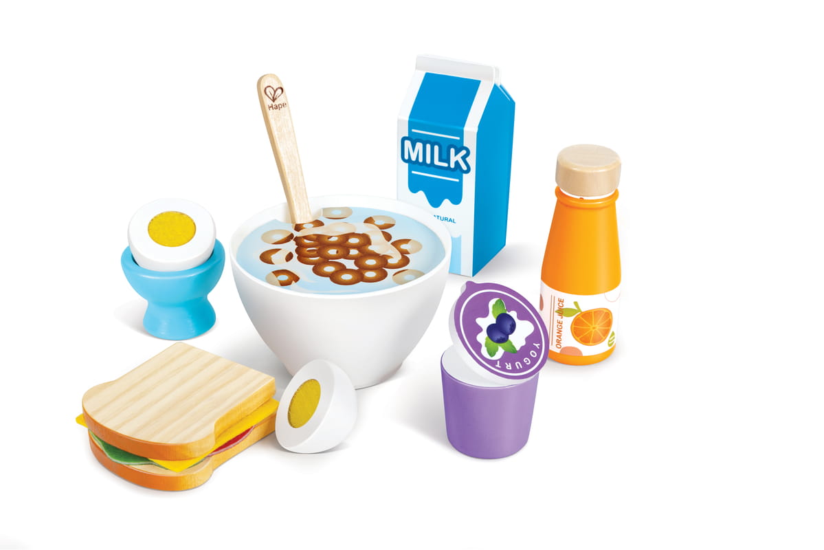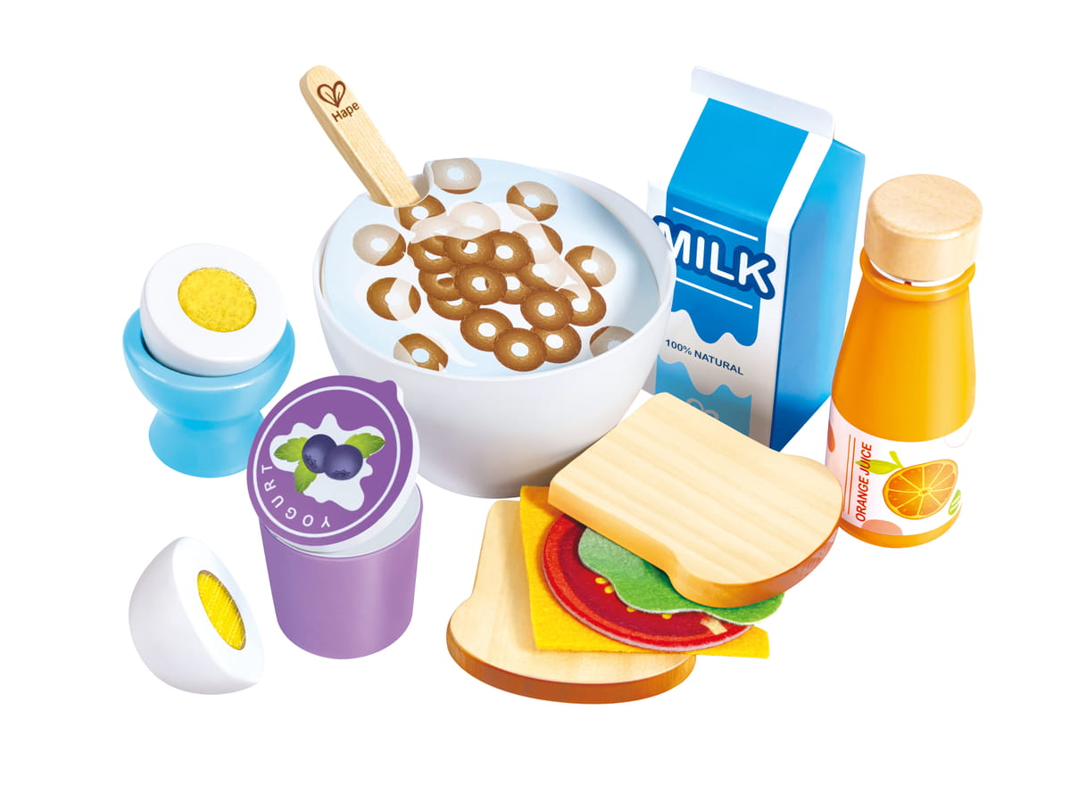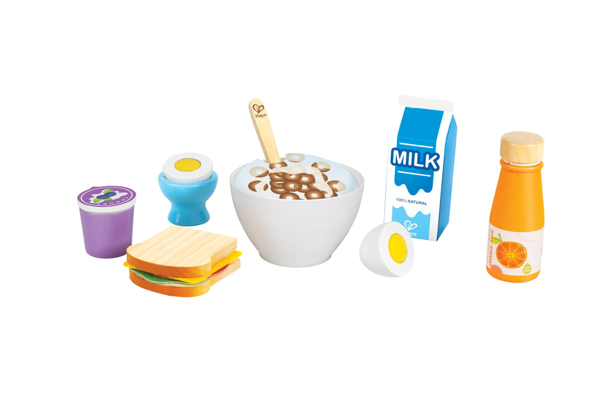 A készletben megtalálható gabona, joghurt, tej, gyümölcslé, tojás, kenyér és több feltét, így a gyerekek változatos reggeli kombinációkat készíthetnek. A játék során fejlődik a képzelőerő, a kommunikáció és a szerepjáték készség, miközben a gyerekek megismerik a mindennapi étkezési szokásokat.