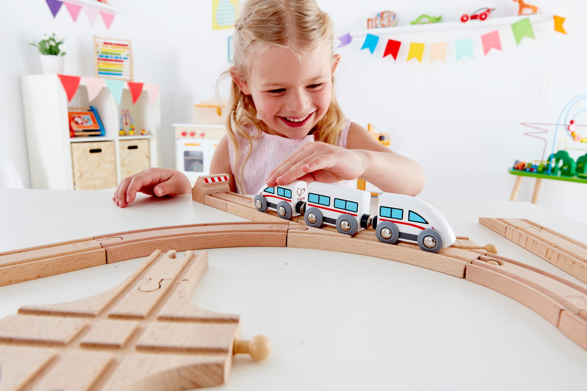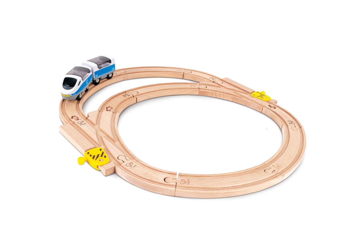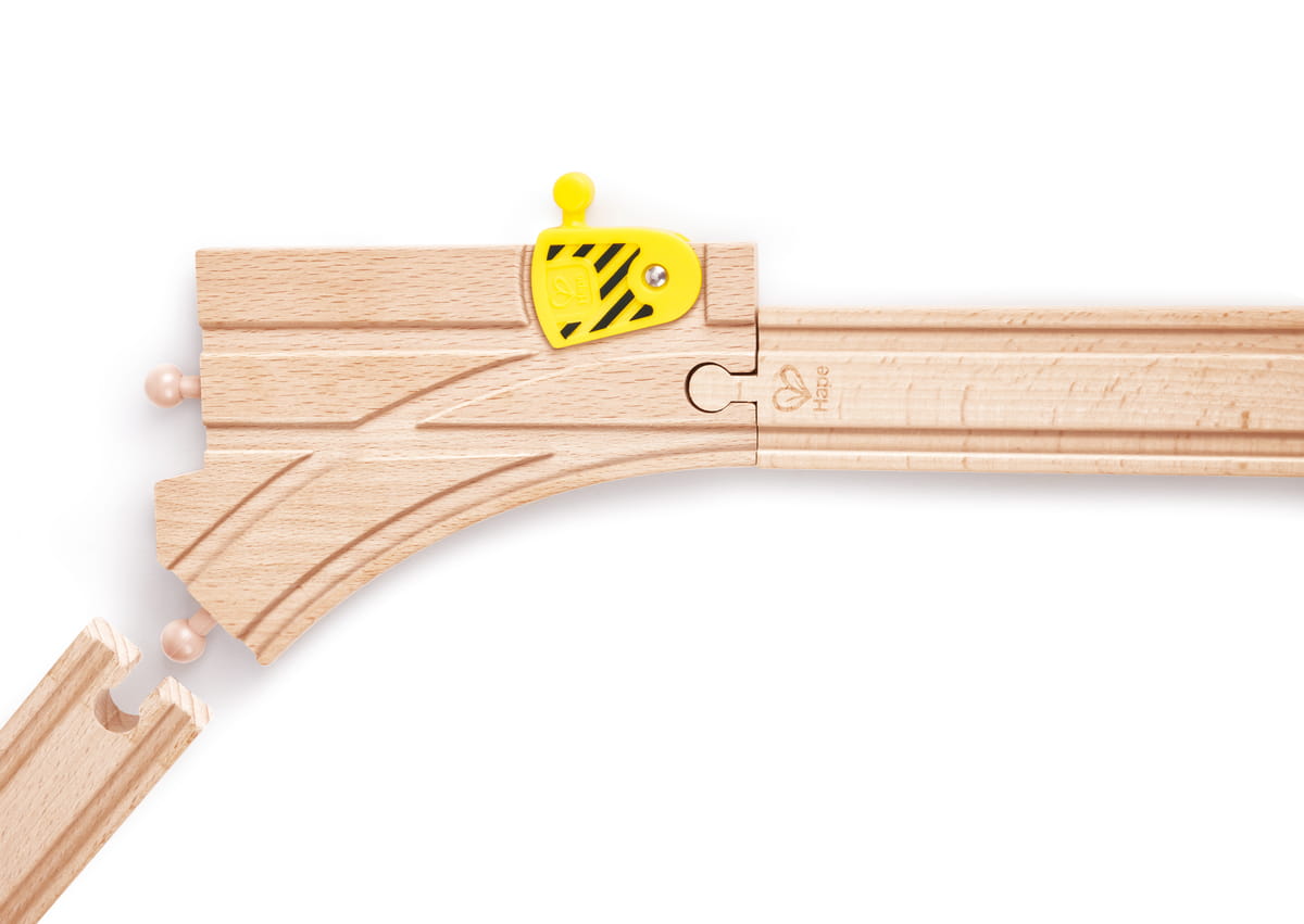 Tömör bükkfából készült, simára csiszolt felülettel, amely kényelmes fogást biztosít a kis kezeknek. A mechanikus váltó lehetővé teszi az irányváltást, így a pálya több útvonalra osztható. Kompatibilis más fa sínrendszerekkel, így könnyedén bővíthető a meglévő vasúti készlet.