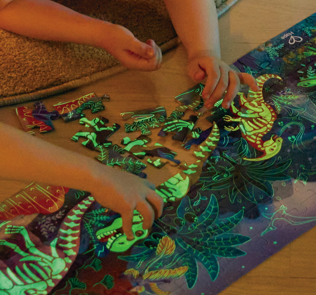 Egy monumentális, 1,5 méter hosszú dinoszaurusz puzzle, amely nappal lenyűgöző részletességgel, éjszaka pedig világító csontvázakkal kel életre. Amikor lekapcsolod a lámpát, a dinoszauruszok csontváza foszforeszkáló módon ragyog a sötétben.